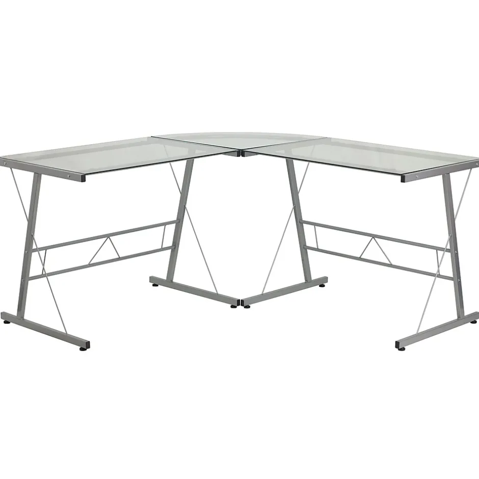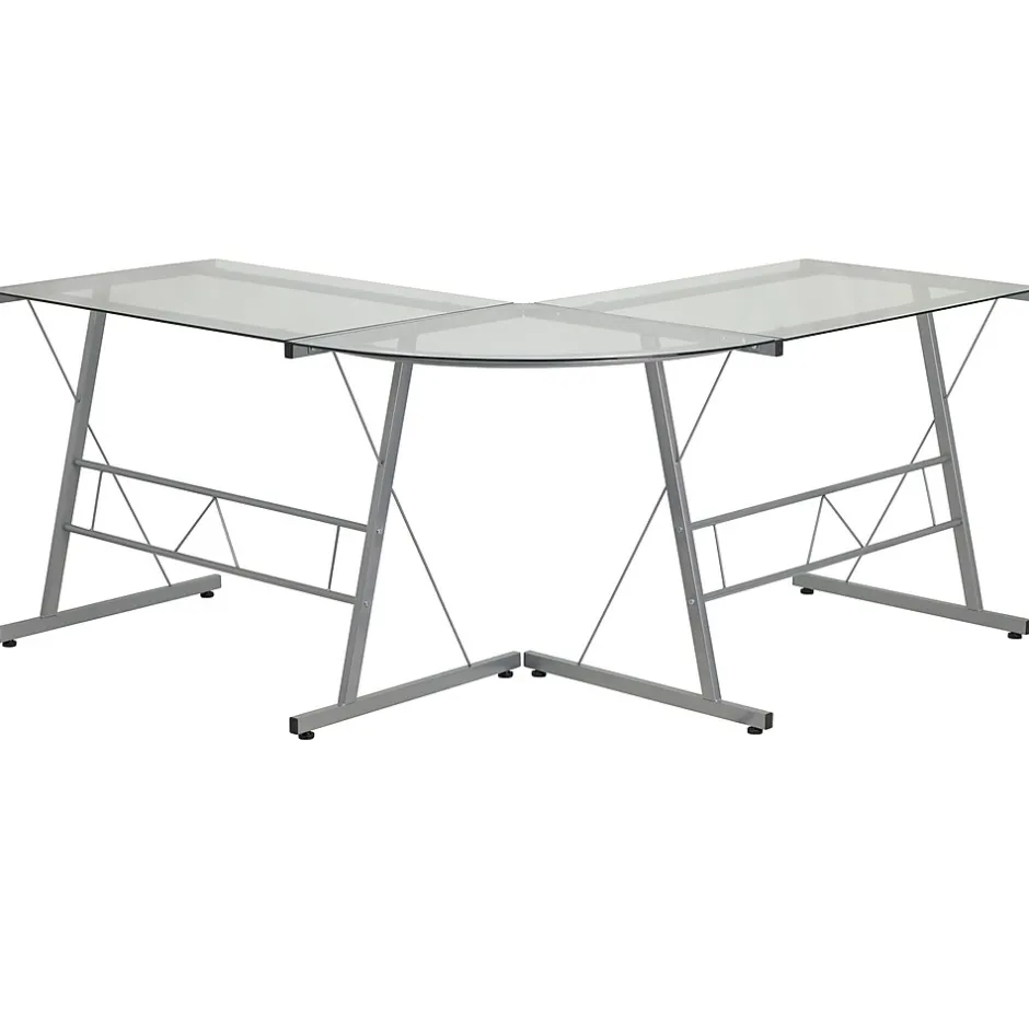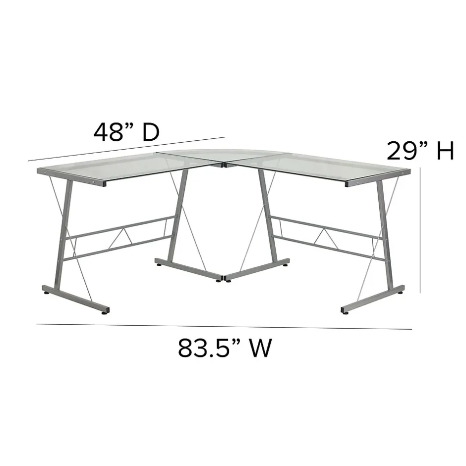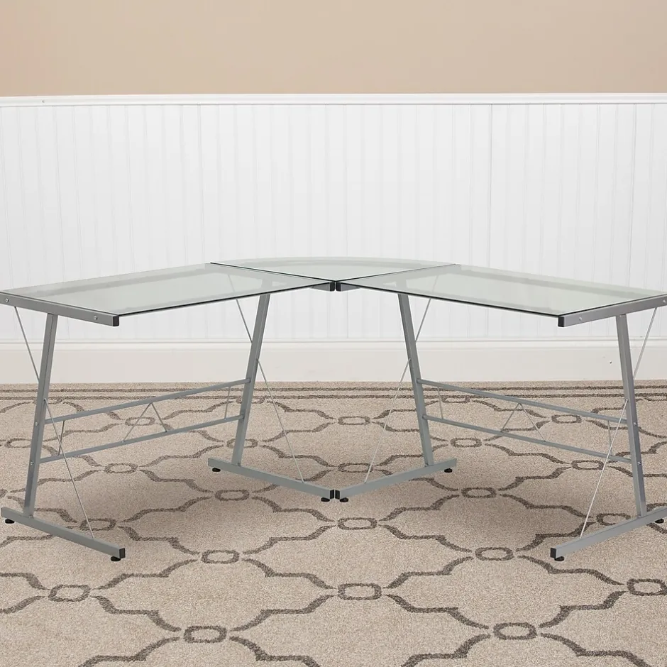 If space is not an issue for you, you should definitely invest in an l-shaped desk. The space that you have on an l-shaped unit is priceless. You will have ample space to accommodate your monitor, laptop, books, office supplies and other necessities. This contemporary computer desk has a clear, tempered glass top that sits atop an open designer frame with attractive bracing. You can place on either corner of a room or come off the wall to add an open concept feel, where you can access the desk from either side. Modernize your work area with a glass computer table that will not make your space feel closed in.