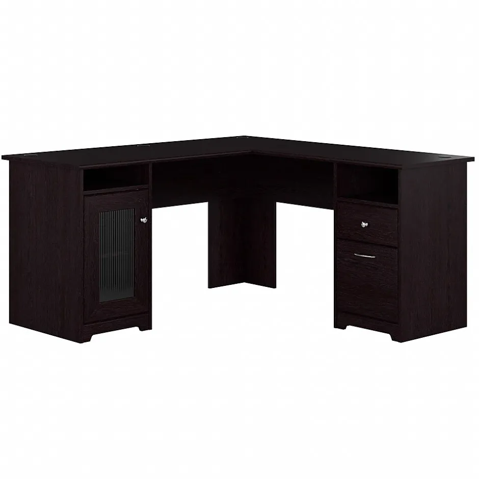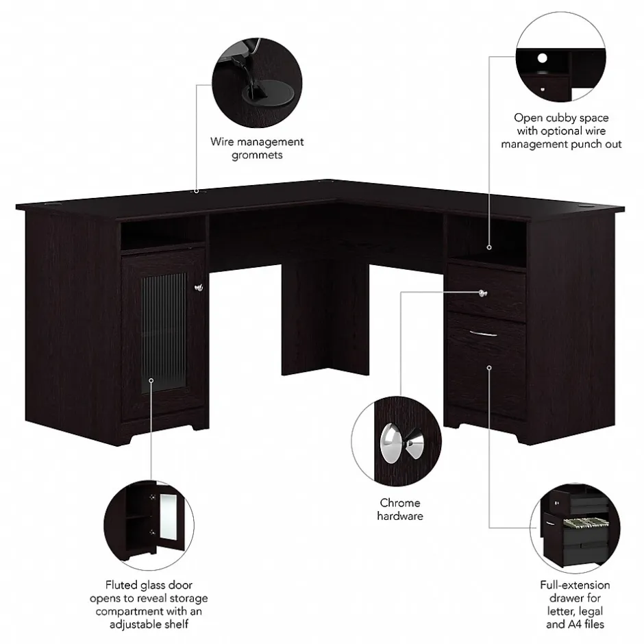 The Bush Furniture Cabot 60W L Shaped Computer Desk offers a spacious and efficient workspace for your home office. Enjoy a beautiful traditional look with smart features for your convenience. The L Shaped Desk design provides a large, durable work surface and just the right amount of storage to keep you feeling neat and organized. Storage details include an enclosed cabinet with a stylish fluted glass door and a box drawer for supplies. A file drawer opens on smooth full-extension ball bearing slides for an effortless reach to letter, legal or A4 sized paperwork. A built-in 4-port USB hub keeps your devices connected. The corner desk design saves space but provides you with 60 inches to spread out in either direction. This home office desk with storage is tested to meet ANSI/BIFMA standards for safety and performance and is backed by the Bush Furniture 1 Year Manufacturer’s Warranty.