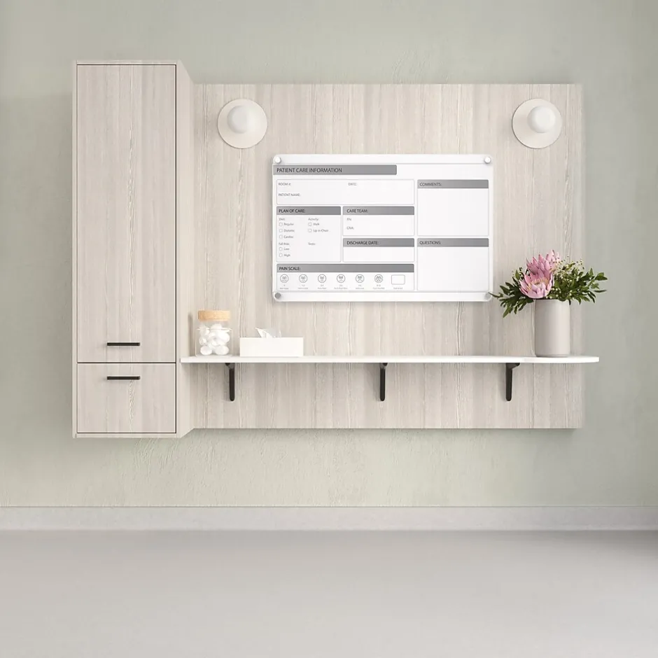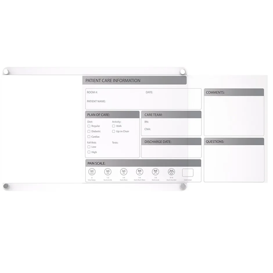 Ghent’s Slide Changeable Patient Room Glassboards are the perfect communication tool for patient care in any healthcare environment. The interchangeable patient communication board comes with a sleek and easy to disinfect glass surface and a changeable, double-sided patient information graphic insert, that can slide to the left or right, to switch between English and Spanish for versatility for effective engagement between patients and care providers. With the look of permanent graphics, the interchangeable insert makes the board flexible, perfect for the ever-changing healthcare environment. Hospital communication boards are a great option for patient rooms to engage in effective communication between nurses, doctors and patients. Patient room boards can help improve HCAHPS and patient satisfaction scores for your hospital. They allow you to showcase different care plans or multiple languages with a removable insert that is easily replaced if branding or initiatives change. Ghent changeable patient room glassboard featured 1/4″ tempered safety glass with radius corners and tamper-resistant standoffs. Glassboards are ideal for healthcare as they withstand high-use and do not ghost or stain, ensuring sensitive patient information is not left behind. Patient room boards are shipped to you in Ghent’s worry-free packaging, designed specifically for shipping glassboards.