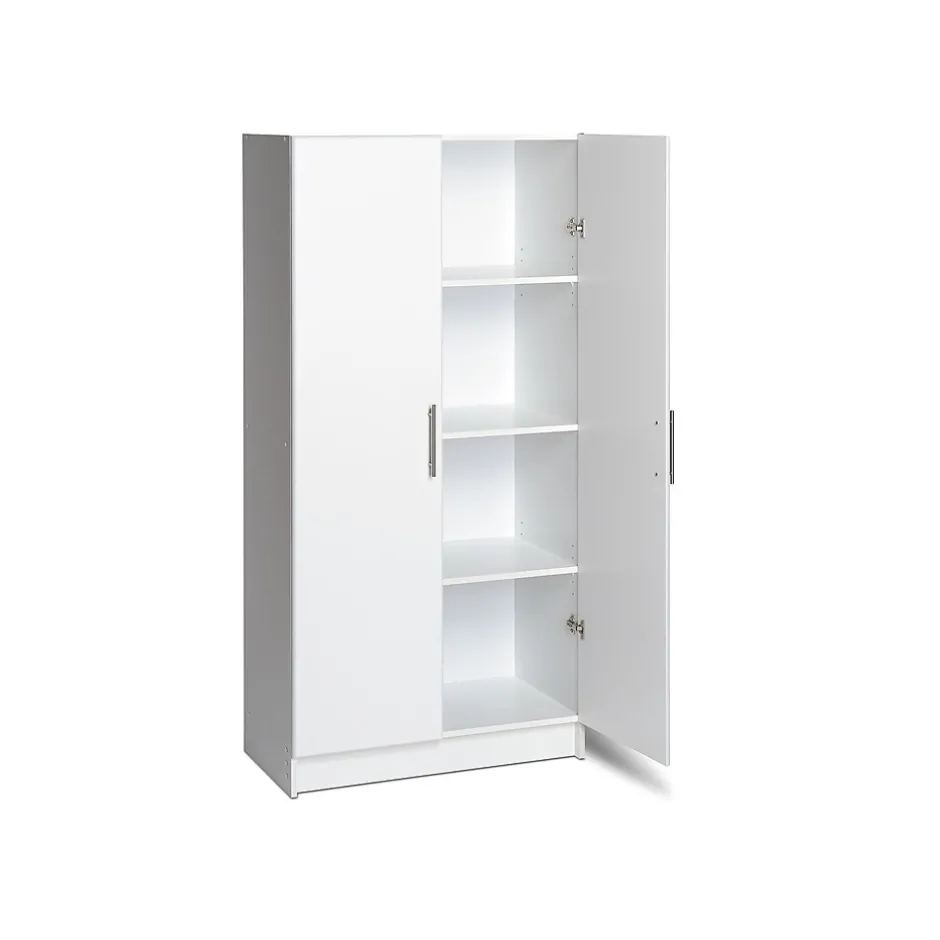 Keep a work space, room, or garage tidy with this two-door storage cabinet. One fixed shelf and two adjustable shelves offer a flexible four-tier storage system, and it’s constructed with laminated wood composite and MDF materials for durability and sustainability. This 32-inch Prepac Elite storage cabinet is all-white and has brushed metal handles for a sophisticated contemporary aesthetic, and each melamine shelf has a 20-pound capacity for sturdy support.