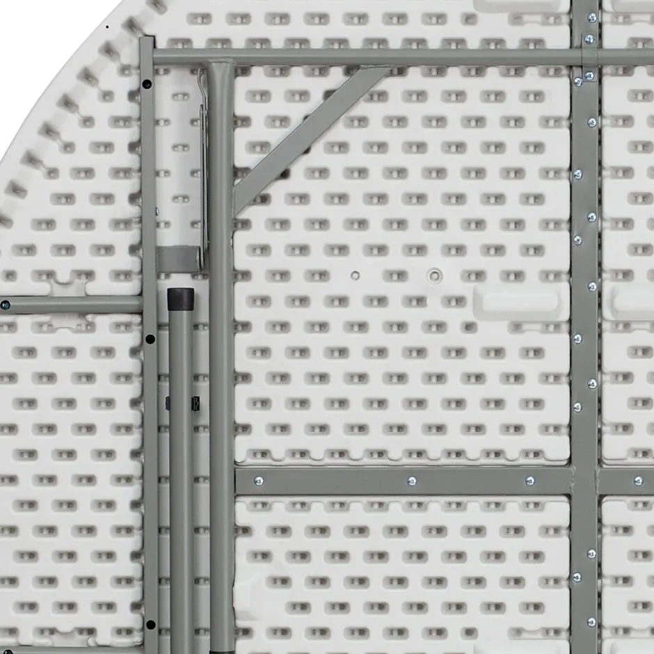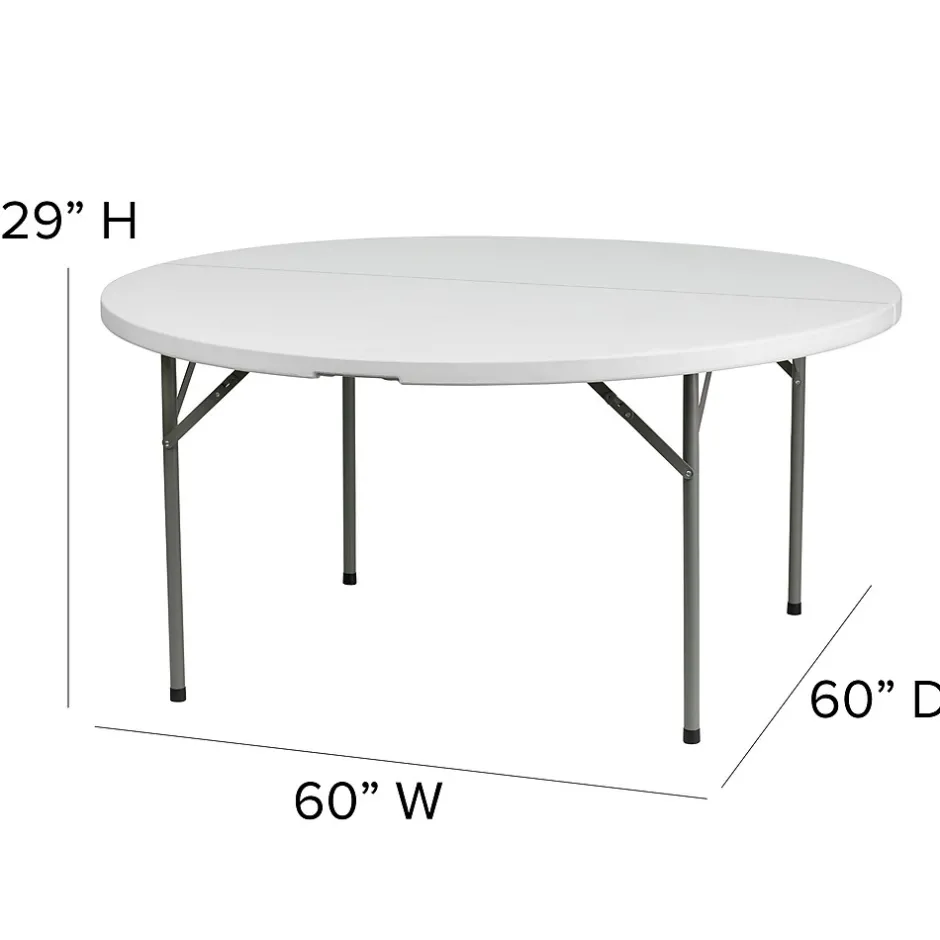 Ensure you have enough surface space for any function and take the stress out of hosting your next gathering. The round folding table is a great option for special event planners, catering companies and banquet facilities. This durable, easy to clean table is commercial rated for use in banquet halls, convention centers and at trade shows. Use during game night, dress it up for holiday parties, and coordinate crafts night. The thick, granite white tabletop is 60″ in diameter, 1.75″ thick, and will comfortably seat up to 8 adults. Its waterproof, impact and stain resistant top have a 880 pound static load capacity. Attractive gray powder coated legs lock securely in place while in use and non-marring floor caps protect your floor by sliding smoothly when you need to move the table. Designed for both indoor and outdoor use, store table indoors and protect the frame from extreme moisture. The 60″ Round Granite White Plastic Folding Table is a convenient option for your next home, school or business event.