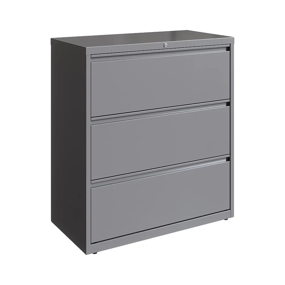 - Three-drawer lateral file cabinet holds letter-, legal-, or A4 size documents