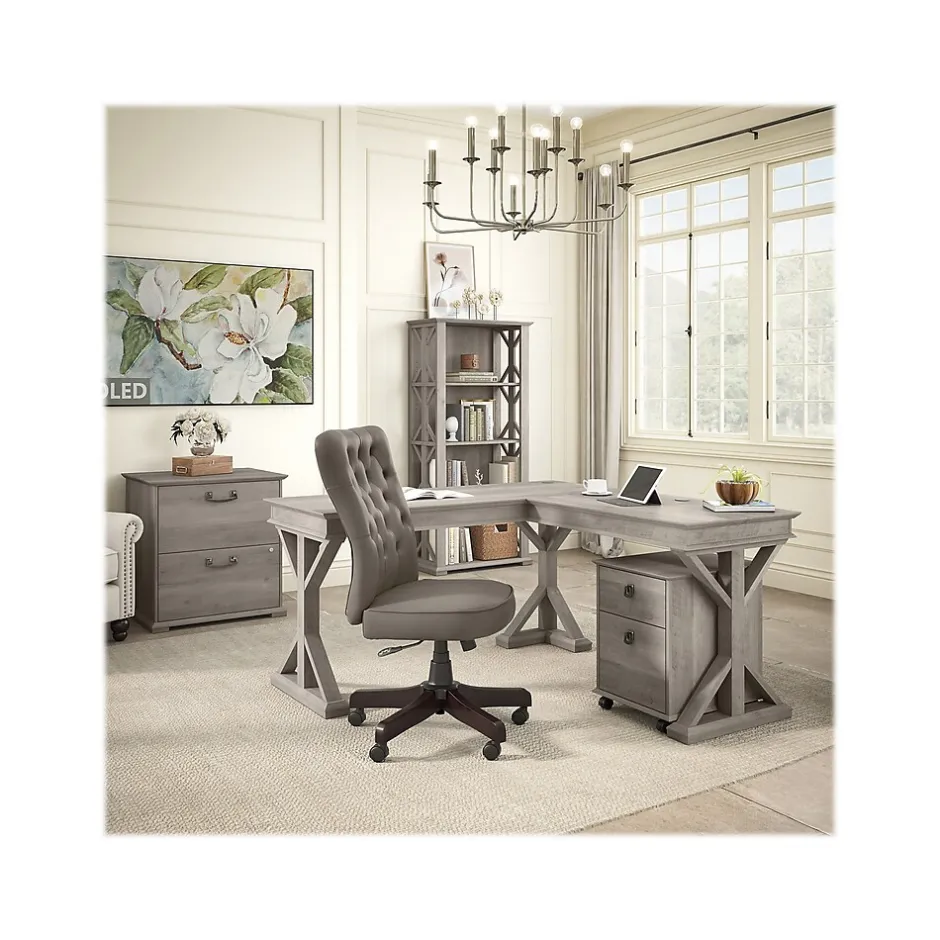 Organize books or give your workspace a personal touch with the Bush Furniture Homestead four-shelf farmhouse bookcase. Safely display pictures and decorations on shelves that support up to 50 lbs. each. Two shelves are fixed for stability, while two can be raised or lowered to accommodate items of various sizes. Tip Guard safety features include a stable design and wall attachment hardware for family-friendly safety in any space. The bookcase has been tested with a 50 lbs. hanging weight to create a safe environment in any work or living space. The decorative trestle pattern and chamfered profile edges give this bookcase a casual farmhouse style. This bookcase has been meticulously tested to meet or exceed the ANSI/SOHO quality standards for safety, durability, and performance and is backed by a 1-year manufacturer warranty. See the full collection for coordinating items.