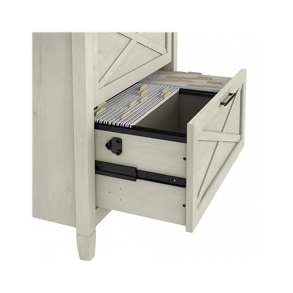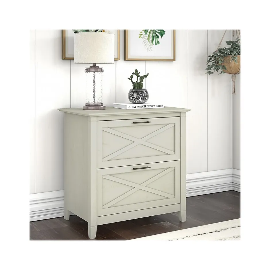 A natural fit for homes that embrace coastal and farmhouse decor, the Bush Furniture Key West two-drawer lateral file cabinet is perfect for organizing paperwork in virtually any room. Two file drawers open on smooth full-extension ball bearing slides for an easy reach to legal- and letter-size documents. Stylish X-shaped accents on the drawer panels create a relaxed style supported by a sturdy and attractive post leg design. This lateral file cabinet matches the height of any Bush Furniture Key West desk (sold separately) to create an extended work surface when placed side by side. The Bush Furniture Key West collection offers a wide variety of farmhouse furniture that makes building a complete home office or living room a breeze. This two-drawer file cabinet is tested to meet ANSI/SOHO quality standards for safety and performance and is backed by the Bush Furniture 1-year manufacturer limited warranty.