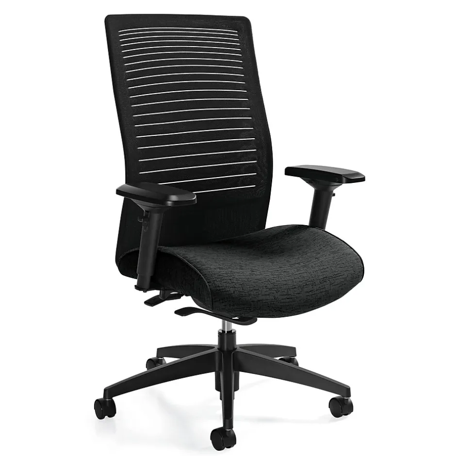 Global Loover High back fabric upholstered synchro-tilter chair in quilt black color has sliding seat depth control and G5 arm caps fulfill user priority. Aluminum finish chair enhances attractive look while nylon governor base gives stability.