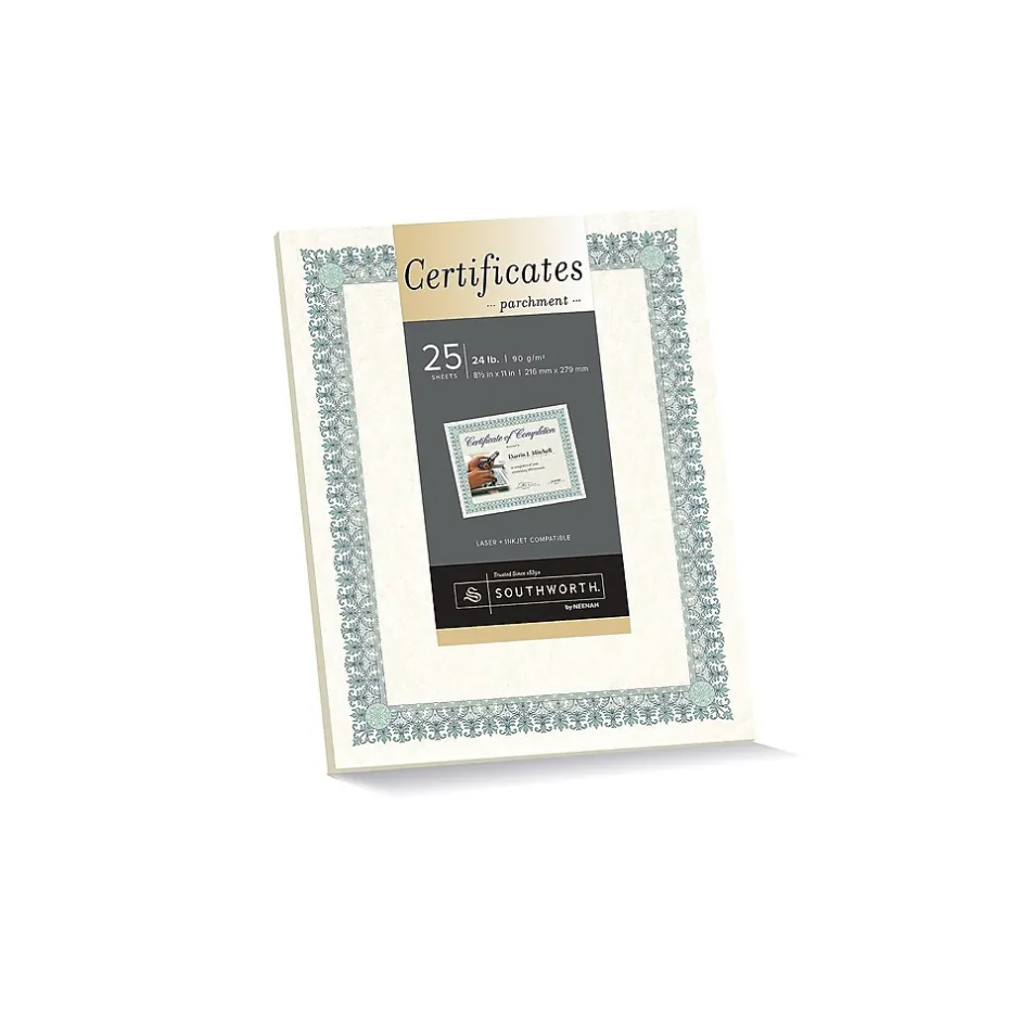 Hand out awards and certificates with this 25-pack of parchment certificates. The pack includes certificate seals for a professional appearance, and the paper is compatible with inkjet and laser printers and copiers for greater versatility. These Southworth foil-enhanced certificates are made from 24-pound card stock to prevent wrinkling.