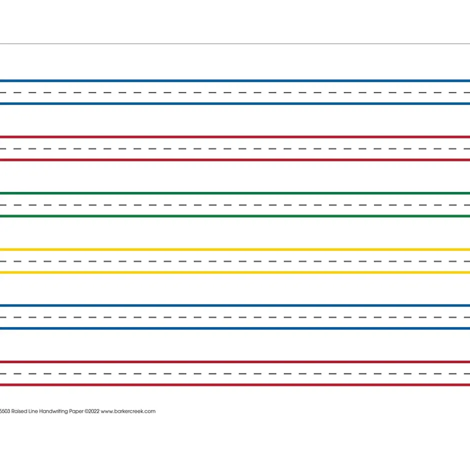 Barker Creek’s Raised Line Handwriting Paper with Color-Coded Raised Rules use sight and touch to strengthen handwriting skills.The raised headlines and baselines help students write within the guidelines.5/8″ ruling with broken center lines and skip spaces for letters with descenders and for making corrections. Color-Coded Sets of rules for directed writing activities such as: Practice writing your name on the blue row; Practice writing As on the red row; Use a green crayon to write Bs on the green row; and Practice writing numbers on the yellow row. Coordinating products available: Search Barker Creek Handwriting Paper.