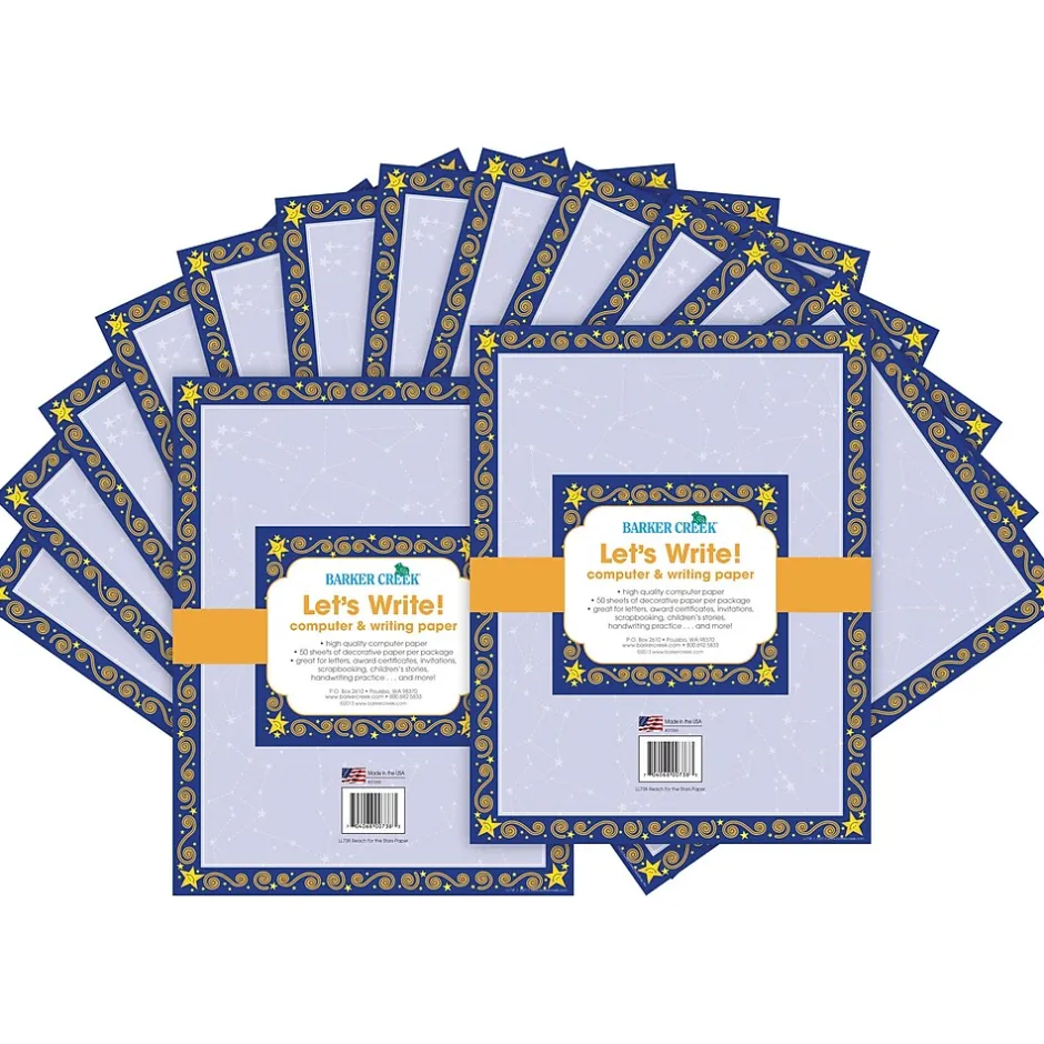 Barker Creek’s Reach for the Stars Computer Paper 2-Pack is affordable and beautiful! Use it vertically for writing letters home and other correspondence and then turn it sideways to create customized award certificates, notices…and more! The possibilities are limited only by your imagination! Each set includes 100 sheets of decorative paper that measure 8 ½” x 11”. This computer paper is compatible with most laser printers. Coordinating product available: Search Barker Creek Reach for the Stars.