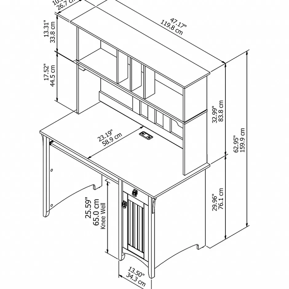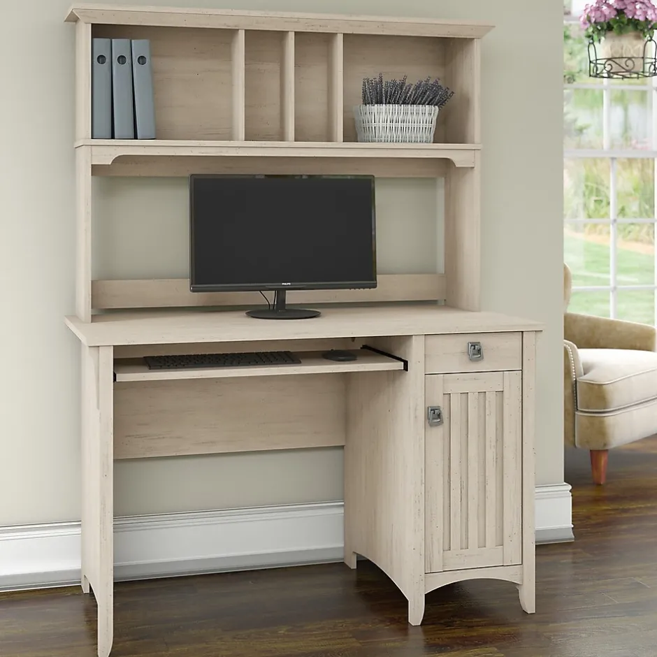 The Bush Furniture Salinas Small Computer Desk with Hutch takes timeless Mission styling and adds plenty of modern touches to help you complete your daily tasks. Technology-ready features include a pullout keyboard tray or laptop shelf and a work surface with built-in wire management to keep cords and cables in order. The Hutch has plenty of storage space for work-in-progress, books, decorations and more while the 48W Desk features a vertical storage cabinet along with a box drawer to organize office supplies and writing utensils. An ideal Computer Desk for small spaces, the compact design boasts a sturdy construction with clean lines, tapered legs and attractive wood detailing. The durable desktop supports up to 200 pounds and offers ample space to complete projects and assignments, pay bills, or surf the web. This home office desk set is backed by a 1 Year Manufacturer’s Warranty.
