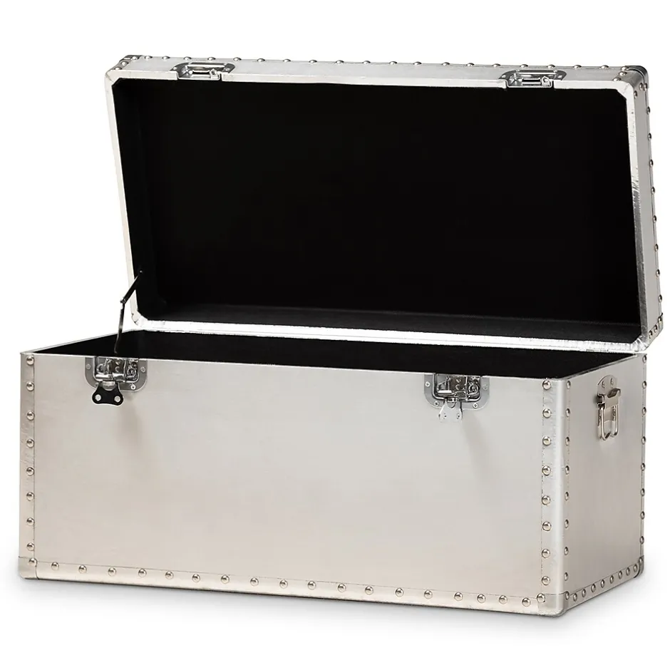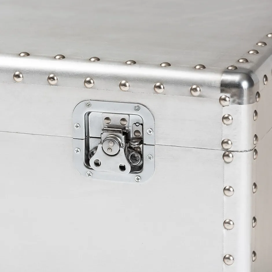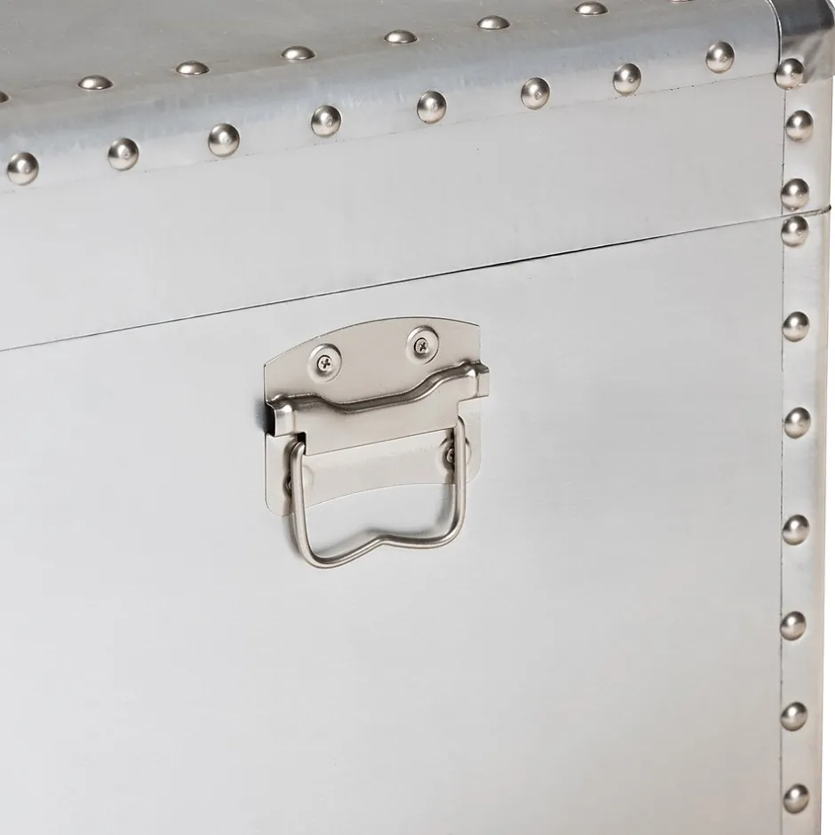 Add cool, vintage industrial-inspired storage to your space with the Serge trunk. Constructed from metal, the Serge features a spacious inner storage compartment. Modeled after antique steamer trunks, the Romain is accented with silver metal handles and imitation locks. Rivets add an extra dose of industrial style. Use the Serge to store extra blankets, pillows, and more. The Serge trunk is made in China and will arrive fully assembled.