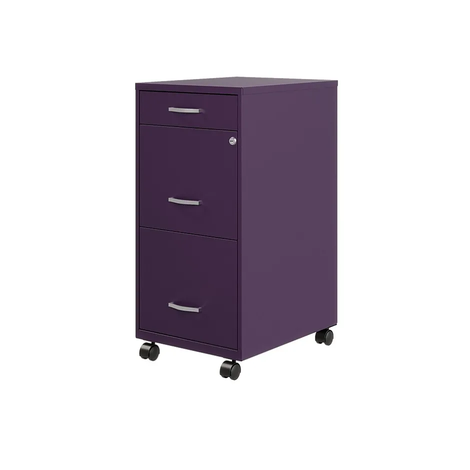 The Three Drawer Metal File Cabinet is a multi-functional storage solution perfect for files, office supplies, and accessories for your small professional office or home office. Featuring two file drawers and one storage drawer, this file cabinet features steel construction and a smart, efficient design. Our compact filing cabinet works well in small spaces and fits under most work surfaces or office desks. Each drawer features high-sides to accommodate letter-sized hanging files. The top accessory drawer is perfect for office storage and organization. The additional wheels that come with this file cabinet are both stylish and functional, making it easy to move around your home or office. Using a patented glide suspension, the drawers have a smooth open and close slide with a three-quarter drawer extension to prevent tipping. In addition, you can keep your files and possessions secure by using the built-in lock for the bottom two drawers. The painted steel surface is non-porous and easy to clean. Bring organization and function to your home or office with this three-drawer file cabinet.
