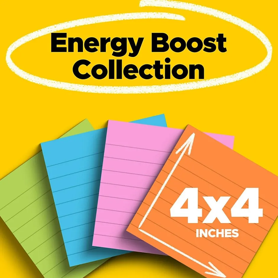 Uplift your spirits and messages via the vibrant, strong colors of the Energy Boost collection. Whether jotting down your daily to-do’s, brainstorming big ideas, studying or setting reminders, colors and ideas are always brighter together. These sticky notes feature 2X the sticking power. They also stick and re-stick – allowing you to move your notes with you throughout your day. They’re ideal for walls, doors, windows and other vertical surfaces, and like all Post-it Notes, they stick securely yet remove cleanly without damage. Keep your ideas across your notebooks, classroom books, calendars or other documents. No tape or tacks are needed with adhesive notes, saving you money and time on office products or school supplies. A great memo pad, these are ideal for using for notes or reminders to yourself or others. Post-it Super Sticky Notes are the perfect solution for shopping lists, reminders, notes on computer screens, time tracking, to-do lists, marking cables, color-coding documents, reminding kids to do chores, storyboarding, scratch paper and agile processing. Each notes sheet is approximately 4 in. x 4 in., with 90 sheets per pad and 4 sticky note pads per pack. These colorful sticky notes include colors from the Energy Boost collection including orange, pink, blue and green. All Post-it Notes are sourced from certified, renewable and responsibly managed forests, and all Post-it Notes are recyclable, so you can recycle them when they are no longer needed.