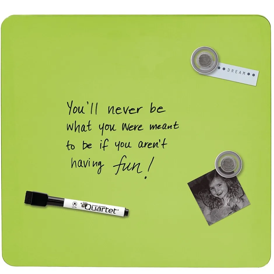 Brighten up your locker, a workspace, or another area with this assorted-color dry-erase board. The magnetic construction allows you to secure notes, memos, and other papers, while the included marker and two magnets make it easy to start using this board right away. This Quartet tin modular frameless square dry-erase board comes with mounting tape for added convenience. Assorted colors include white, blue, pruprle, or green. Color is chosen at random, no requests.