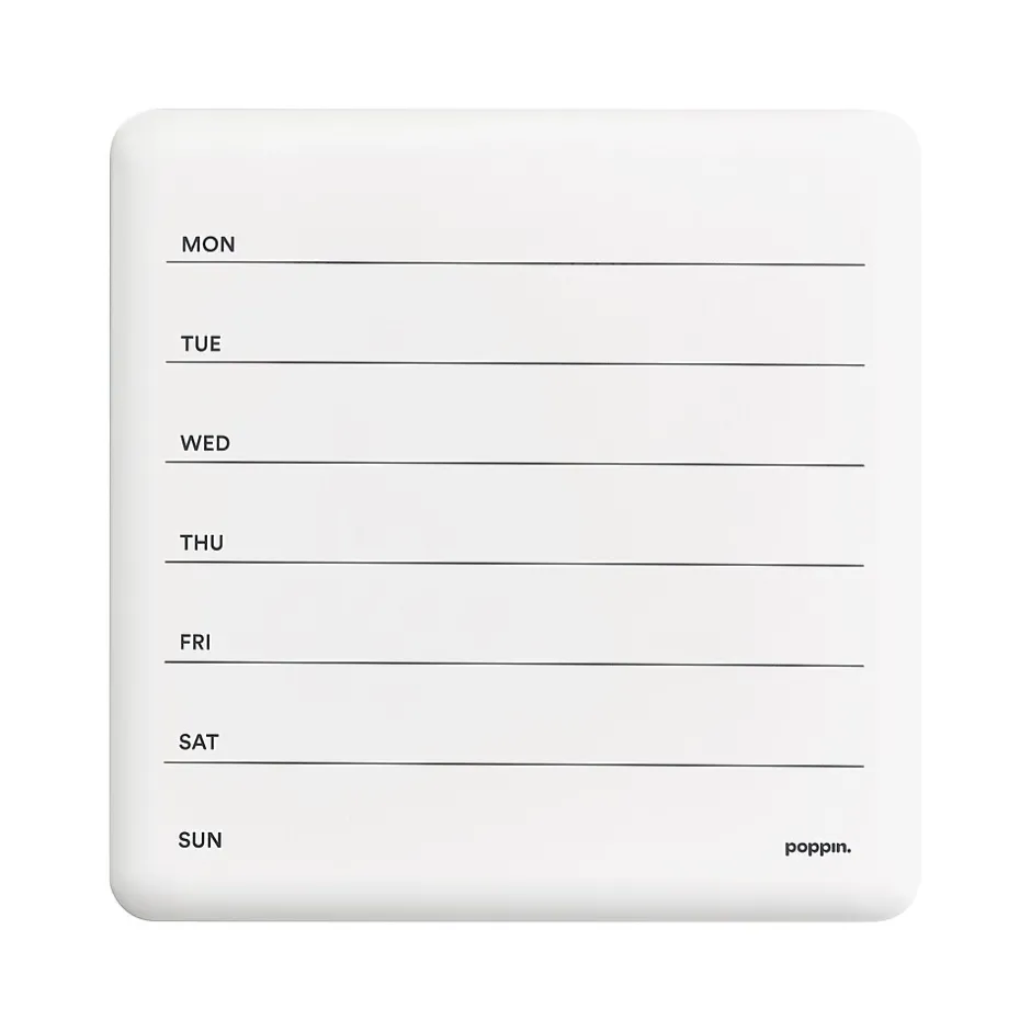 Put your week up on the wall with the Poppin magnetic weekly dry-erase board. Printed with a handy weekly layout, the board is perfect for meal planning, sharing family calendars, and looking forward to Friday. The preprinted weekly layout helps you keep it all together. Includes removable adhesive strips, magnets, and screws for mounting.