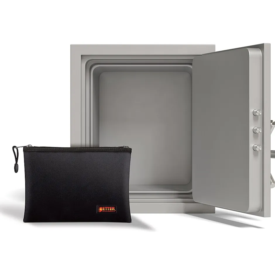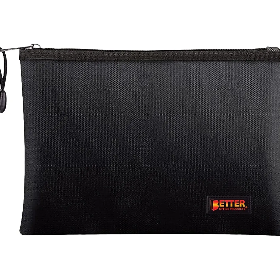 The Better Office fireproof document bag features a full-length zipper and holds legal-, letter-, and A4-size documents and other valuables such as jewelry, passports, thumb drives, and more. Tested and approved to withstand the harsh conditions associated with fire and water damage. Always close the zipper fully to minimize potential exposure. Do not immerse the bag to clean. Spot-clean with a damp cloth, as needed.