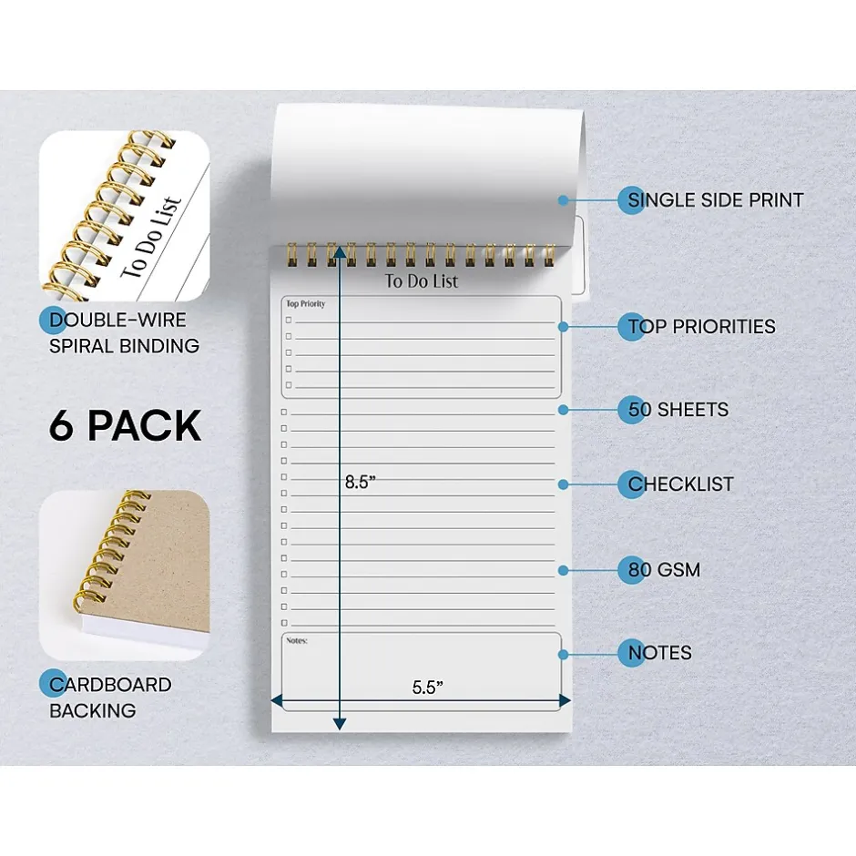 This To-Do List 50-sheet notepad by Better Office features thick sheets with an attractive and simple design. Its twin-wire spiral top binding keeps the 5.5″ x 8.5″ mini-size sheets intact for easy viewing. Use it to keep track of all your goals, activities, deliverables, and projects.