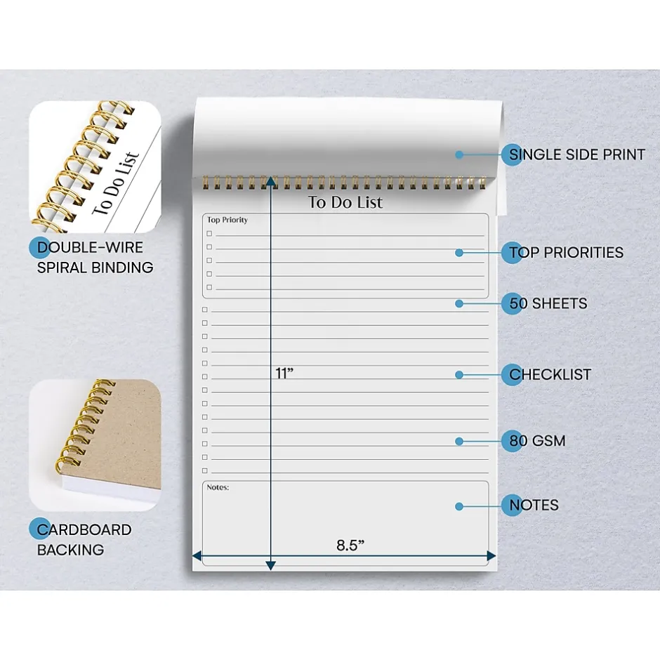 - Tear off sheets as needed or keep them intact to be able to look back on your prior tasks with the double-wire spiral binding on the top
