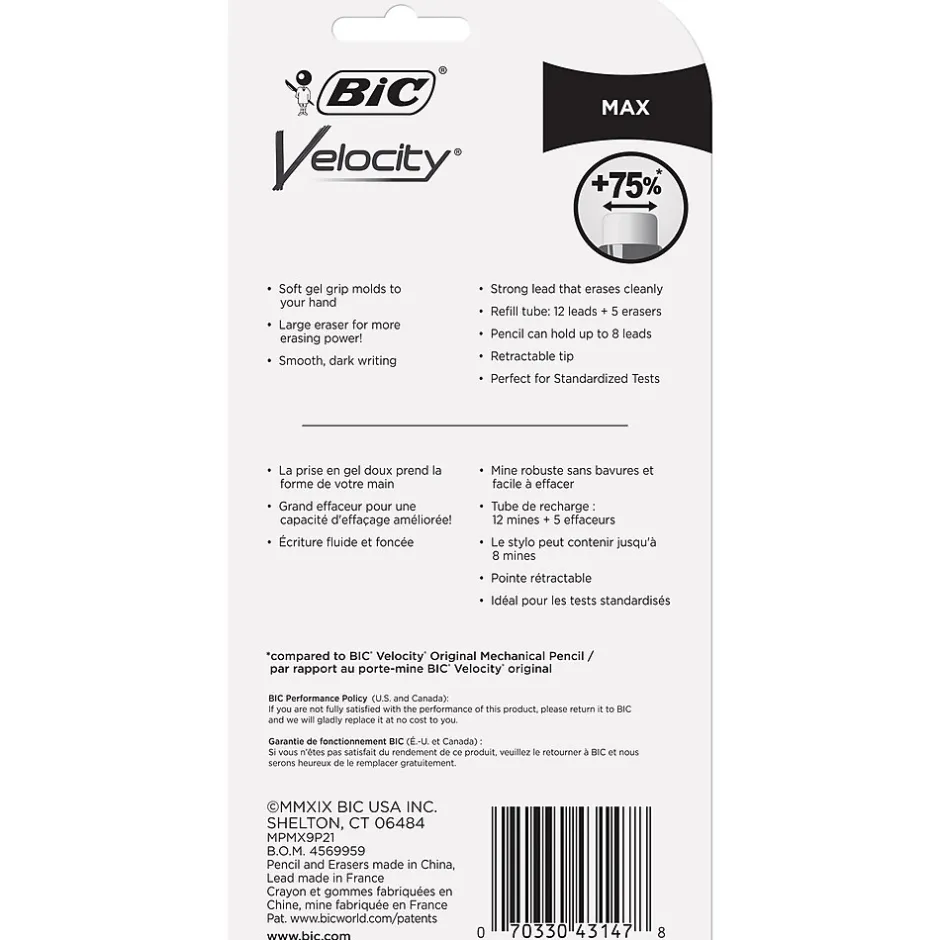 BIC Velocity Max mechanical pencils have 0.9 mm thick retractable and replaceable leads that offer bold, dark lines for easy-to-read writing. An eraser that’s 75-percent wider than the BIC Velocity Original mechanical pencil ensures that any errors are easily erased, leaving clean, smudge-free documents. A comfortable soft gel grip and a lightweight barrel contours to your unique grip while reducing writing fatigue. With two mechanical pencils and additional replacement leads and erasers, this pack of mechanical pencils provides a sufficient supply while eliminating waste.