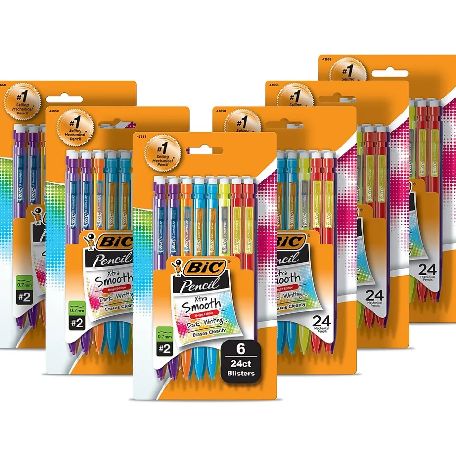 Experience smooth, dark writing with the BIC Xtra-Smooth Bright Edition No. 2 mechanical pencils with erasers. These 0.7mm mechanical pencils have a medium point that’s perfect for a variety of everyday writing activities. The high-quality lead doesn’t smudge and erases cleanly, so your work looks professional and neat. Always ready, the BIC Xtra-Smooth Bright Edition No. 2 pencils are convenient, reliable, and never need sharpening: simply click the built-in eraser to advance the lead. They’re the perfect mechanical pencils for school and come equipped with three pieces of No. 2 lead that’s compatible with most standardized tests. With a clear barrel, these mechanical pencils have a sophisticated, modern look, and their colorful clips easily attach to pockets, notebooks, and more.