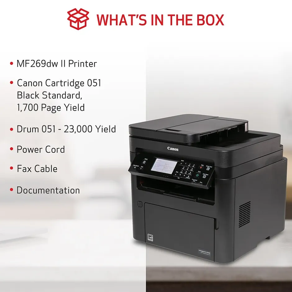 - Package includes: MF269dw II printer, 051 black cartridge (1700-page yield), 051 drum (23000-page yield), power cord, fax cable, documentation