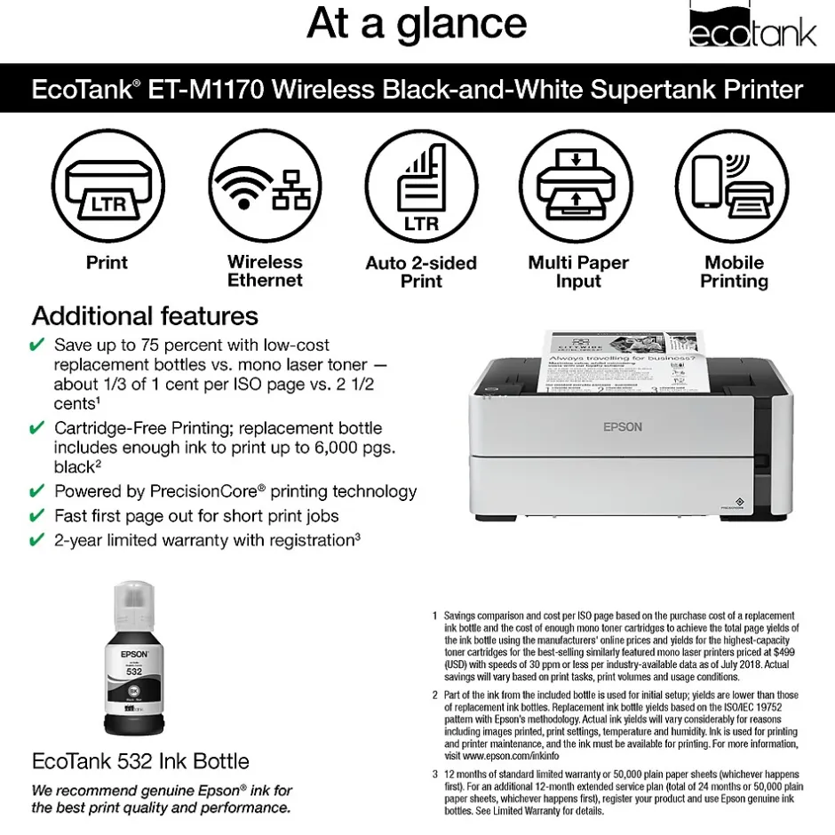 The EcoTank ET-M1170 monochrome supertank printer, powered by PrecisionCore, offers worry-free, Cartridge-Free Printing with an easy-to-fill, supersized ink tank. Users save up to 75 percent with low-cost replacement bottles vs. mono laser toner — about 1/3 of 1 cent per ISO page vs. 2 ½ cents. The ET-M1170’s replacement ink bottle includes enough ink to print up to 6,000 pages. It features fast print speeds and a fast first page out. Plus, it offers a 250-sheet paper tray, auto 2-sided printing, and convenient wired and wireless networking. And, you save energy with lower power consumption vs. laser. And, it’s backed by a 2-year limited warranty with registration.