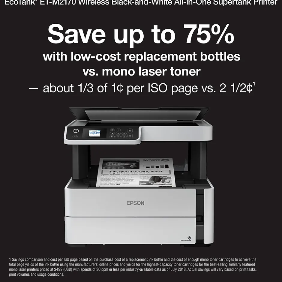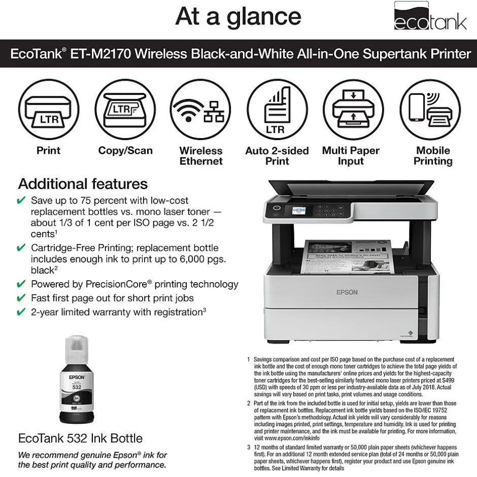 The EcoTank ET-M2170 monochrome supertank all-in-one printer, powered by PrecisionCore, offers worry-free, Cartridge-Free Printing with easy-to-fill, supersized ink tanks. Users save up to 75 percent with low-cost replacement bottles vs. mono laser toner — about 1/3 of 1 cent per ISO page vs. 2 ½ cents. The ET-M2170’s replacement ink bottle includes enough ink to print up to 6,000 pages. It features fast print speeds and a fast first page out. Plus, it offers a 250-sheet paper tray, auto 2-sided printing, and wired and wireless networking. And, you save energy with lower power consumption vs. laser. Plus, it’s backed by a 2-year limited warranty with registration.