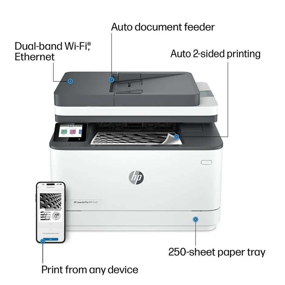 Get fast speeds and powerful productivity with the multifunction LaserJet Pro 3101fdw. Get laser quality black & white printing for all your business documents. Set up and manage printers in multiple locations with a single dashboard.