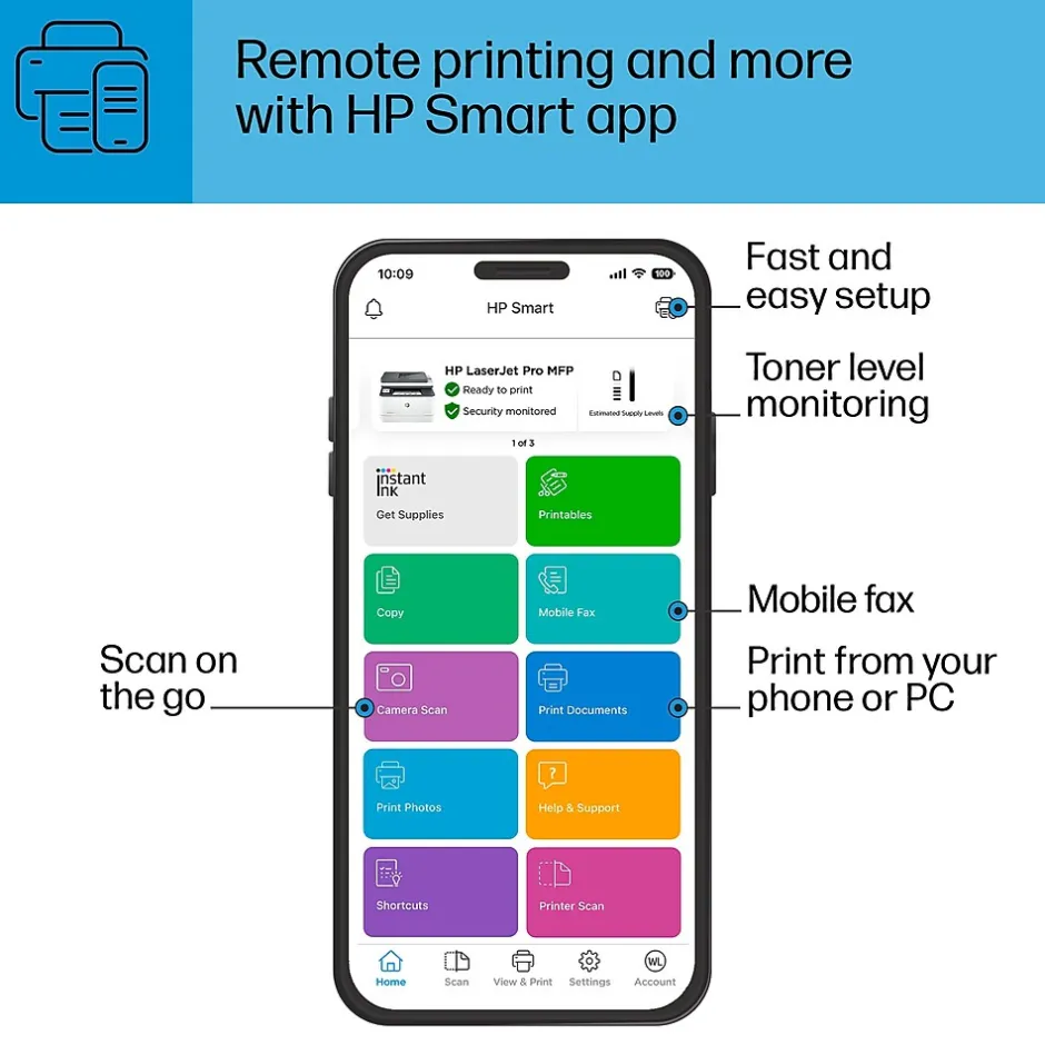 - FAST AND EFFORTLESS – Fast print speeds, auto paper jam recovery and self-healing Wi-FiTM. Seamlessly manage multiple printers from anywhere with a single dashboard.