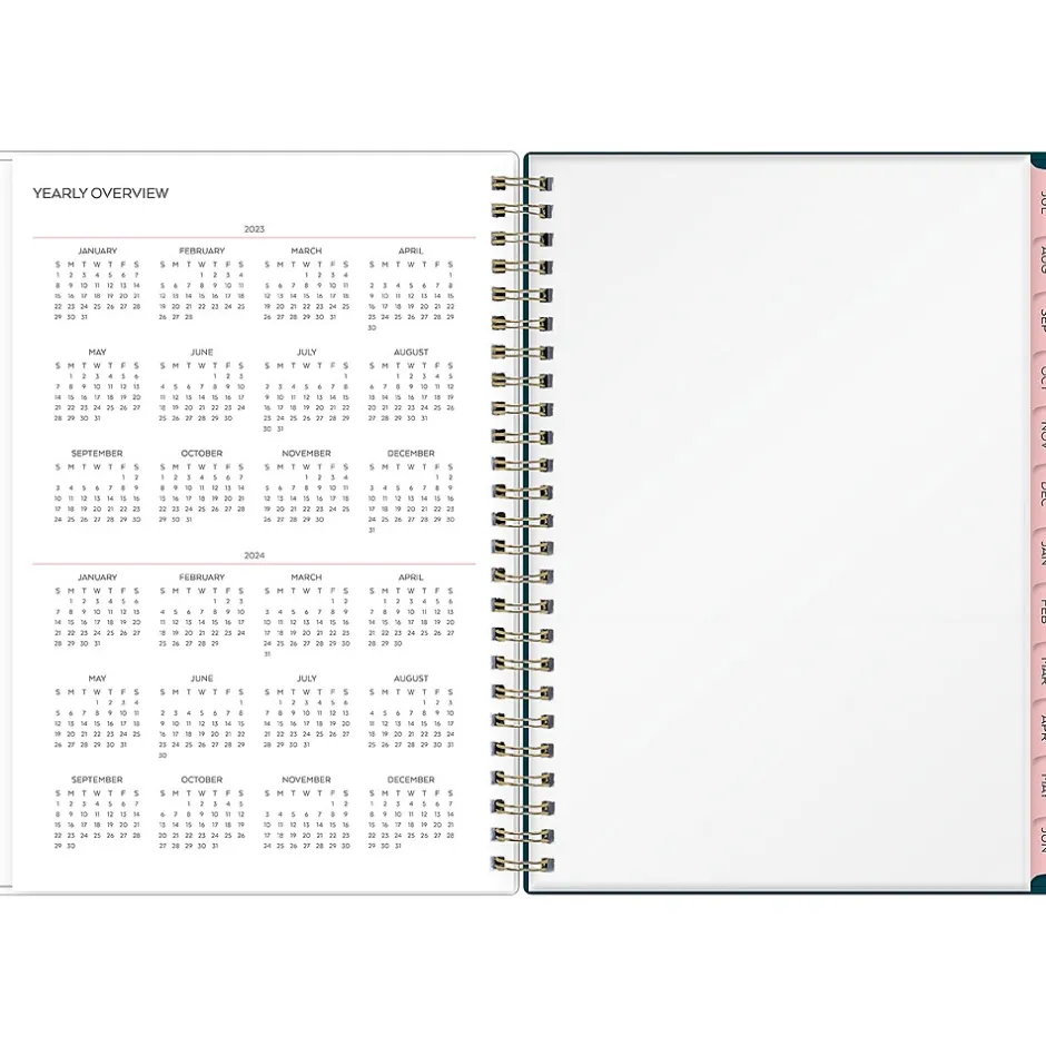 - Features one month per two pages and one week per two pages with space for notes and quick reference calendars