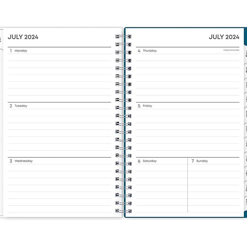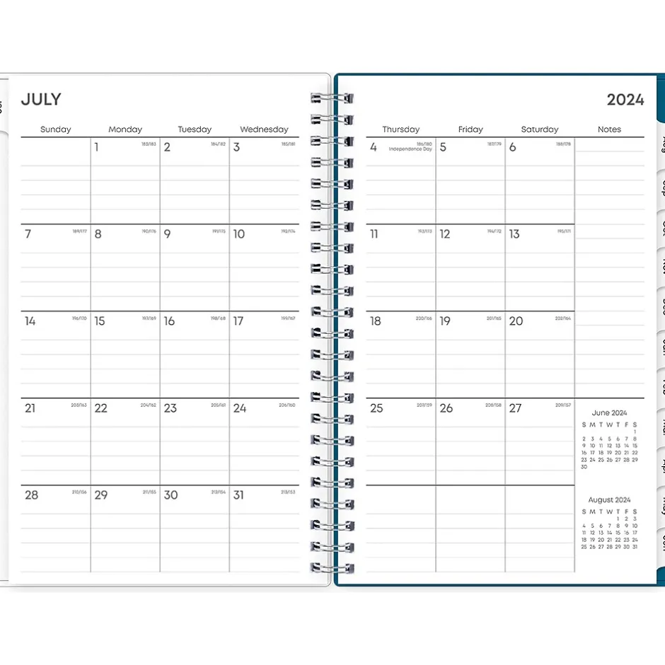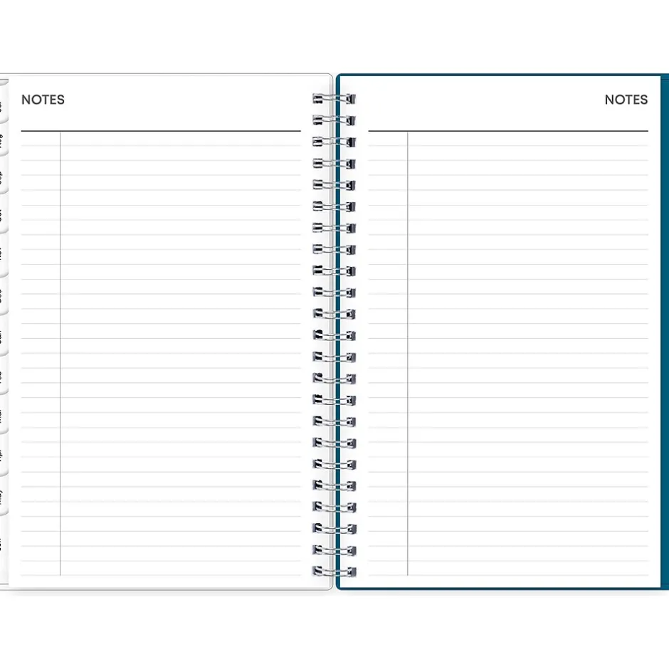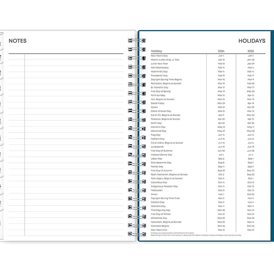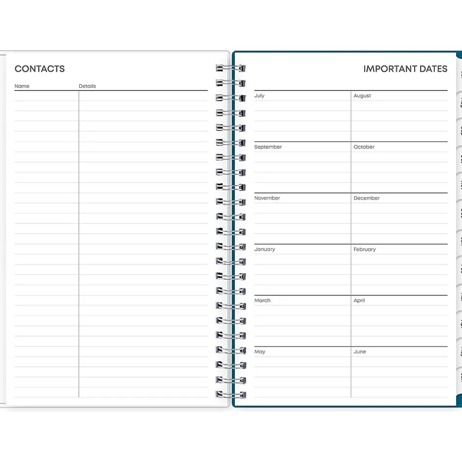 - Features one month per two pages and one week per two pages, with important dates, holiday list, contacts, and notes