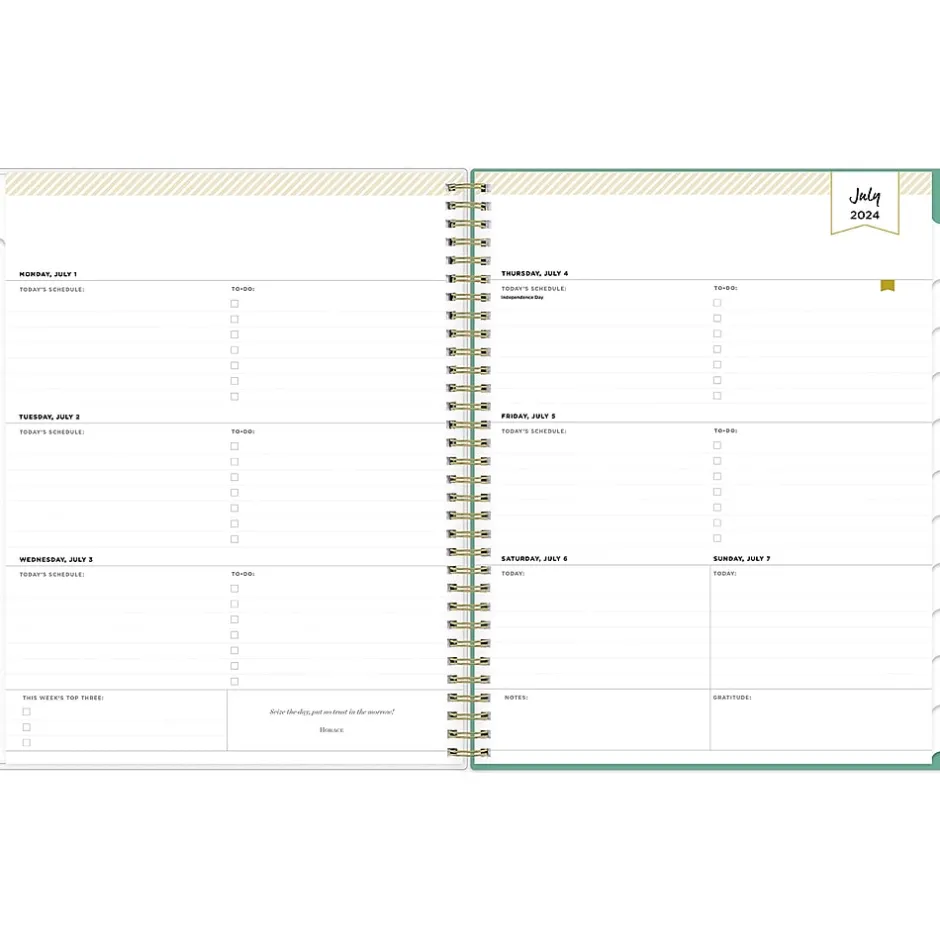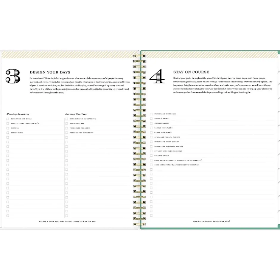 - One week per two-page spread with top three, notes, and gratitude sections; one month per two-page spread with notes and to-do sections; yearly overview and goal-setting pages