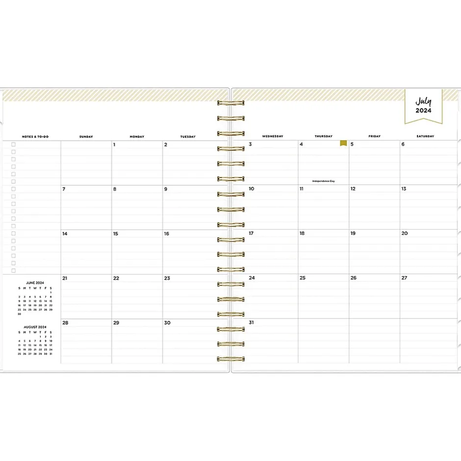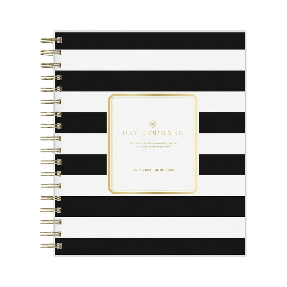 Design your year with Day Designer for Blue Sky academic planners. The Rugby Stripe 2024-2025 daily and monthly planner has hourly planning pages to manage a busy schedule and time-block activities. One page per weekday, and weekends appear on the same page. Includes tabbed monthly views, a storage pocket, stickers, and goal-setting pages.
