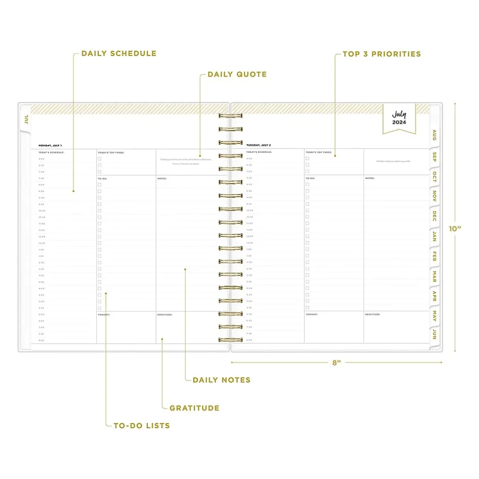 - Daily and monthly academic planner covers a 12-month date range from July 2024 through June 2025