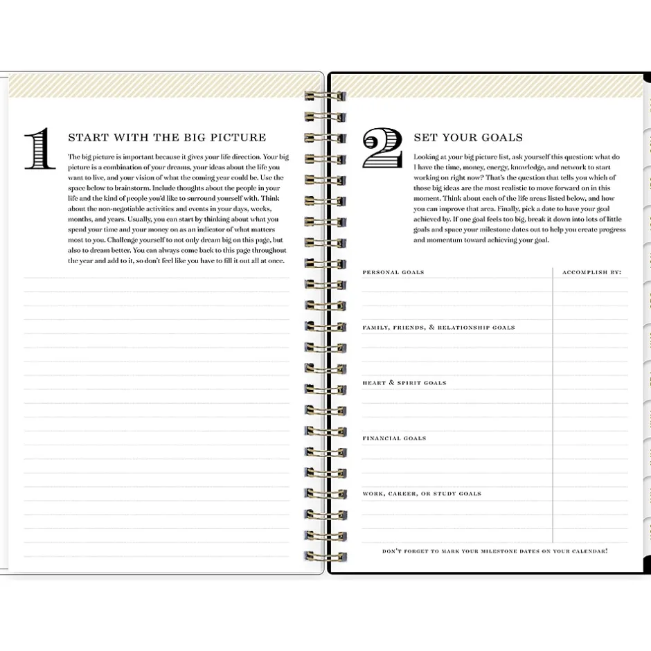 - Includes a storage pocket, gold-tone foil stickers, notes pages, and four-step guide to goal setting