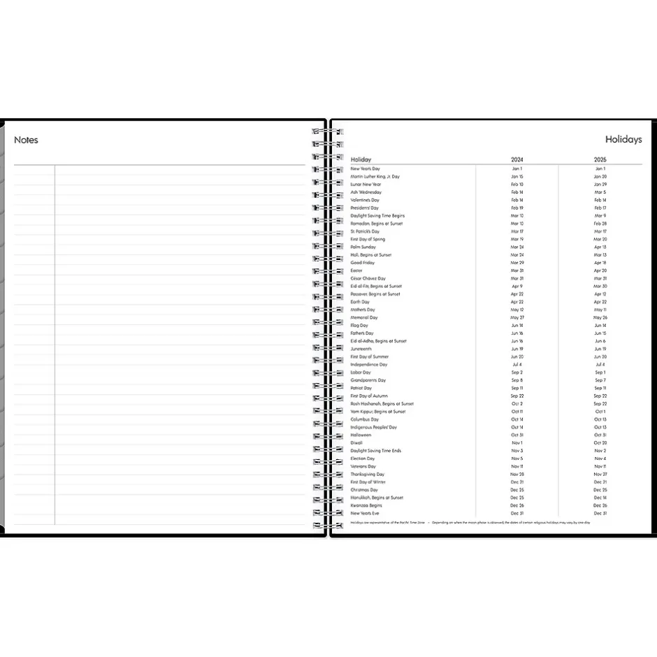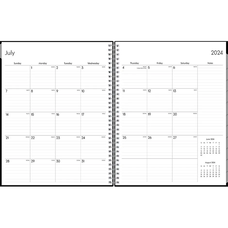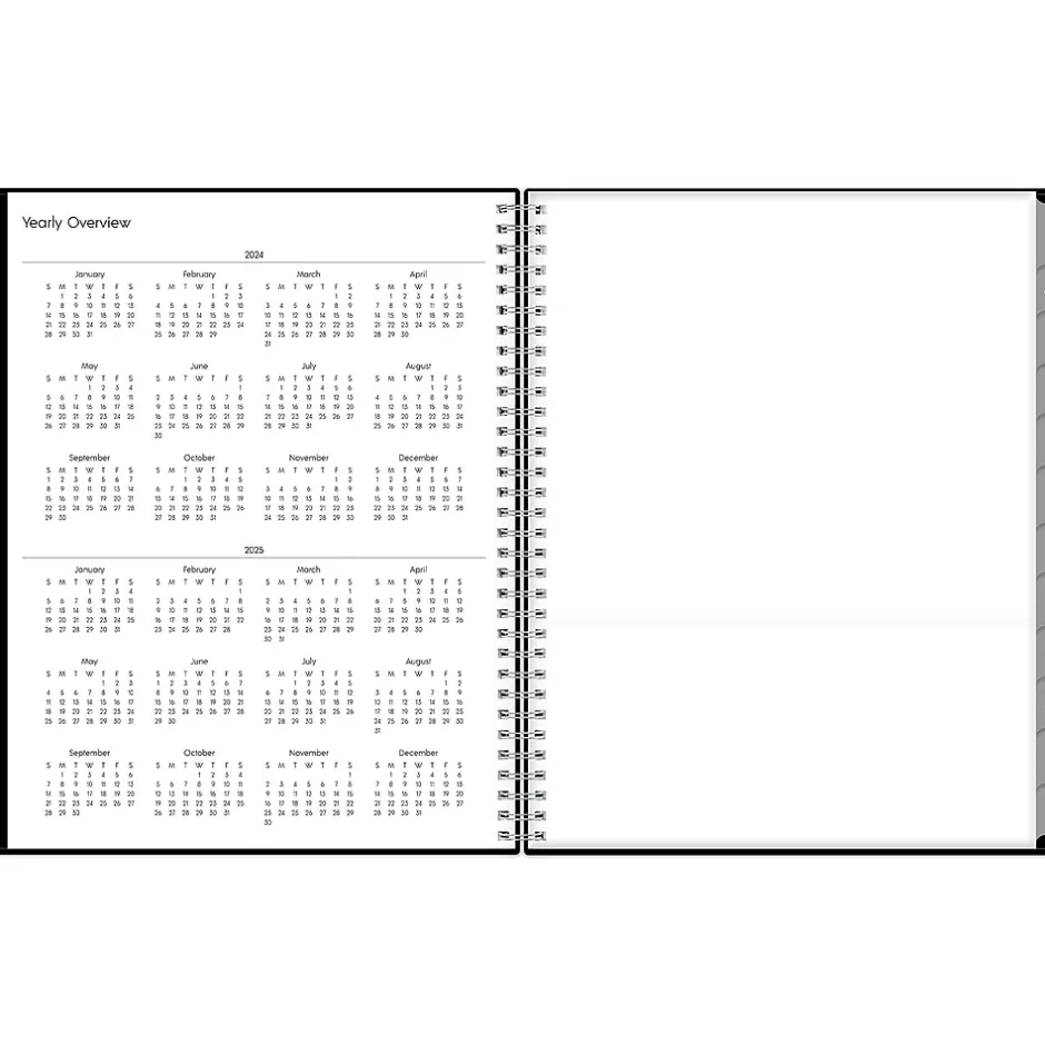 - Offers one month per two pages and one week per two pages, with space for notes and quick reference calendars