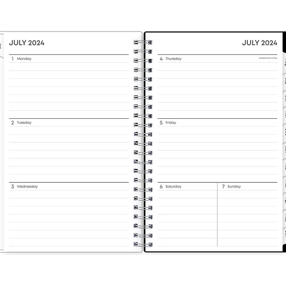 - One week per view, one month per view, notes pages and reference calendars, contacts, goals, holidays, and important dates