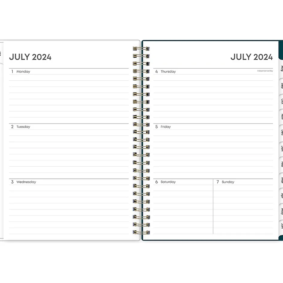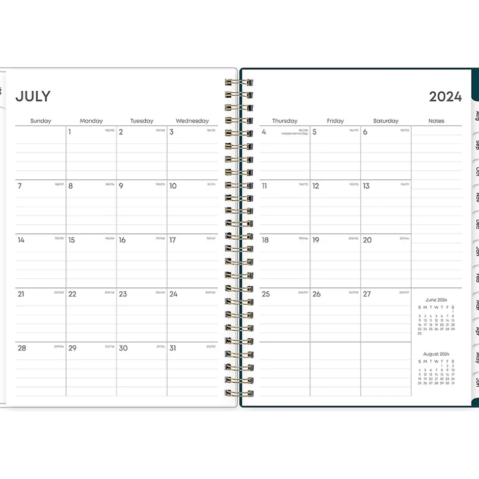 - Weekly and monthly academic planner covers a 12-month academic date range from July 2024 to June 2025