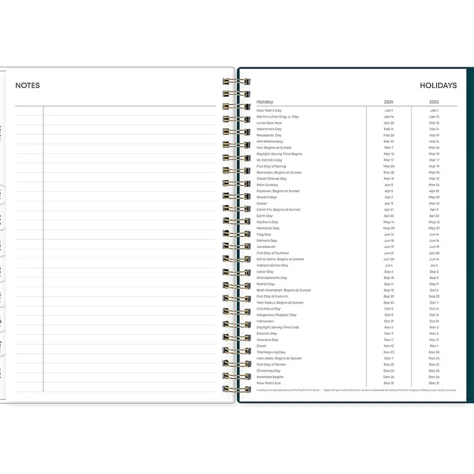 - 30 notes pages, contacts, goals, holidays, and important dates