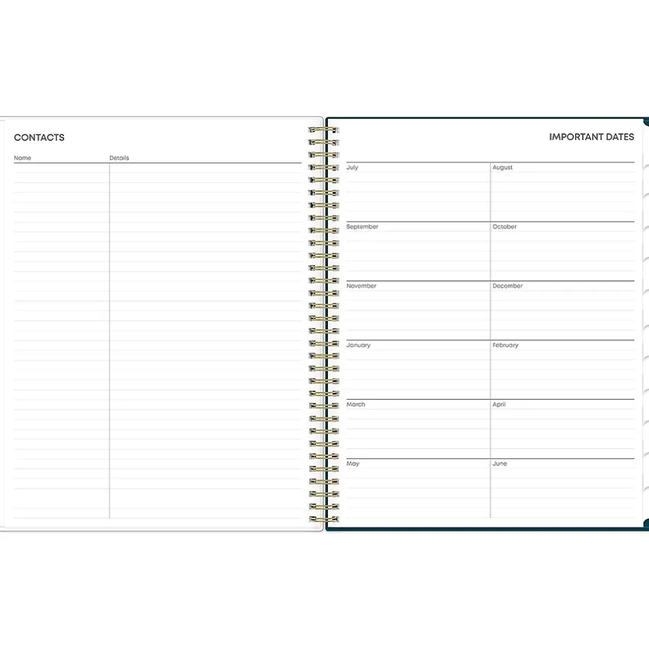- Includes notes pages, reference calendars, contacts, goals, holidays, and important dates
