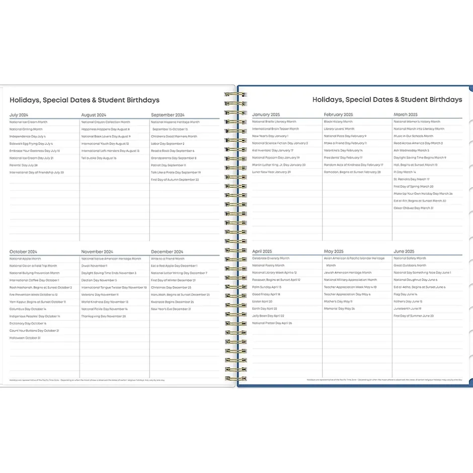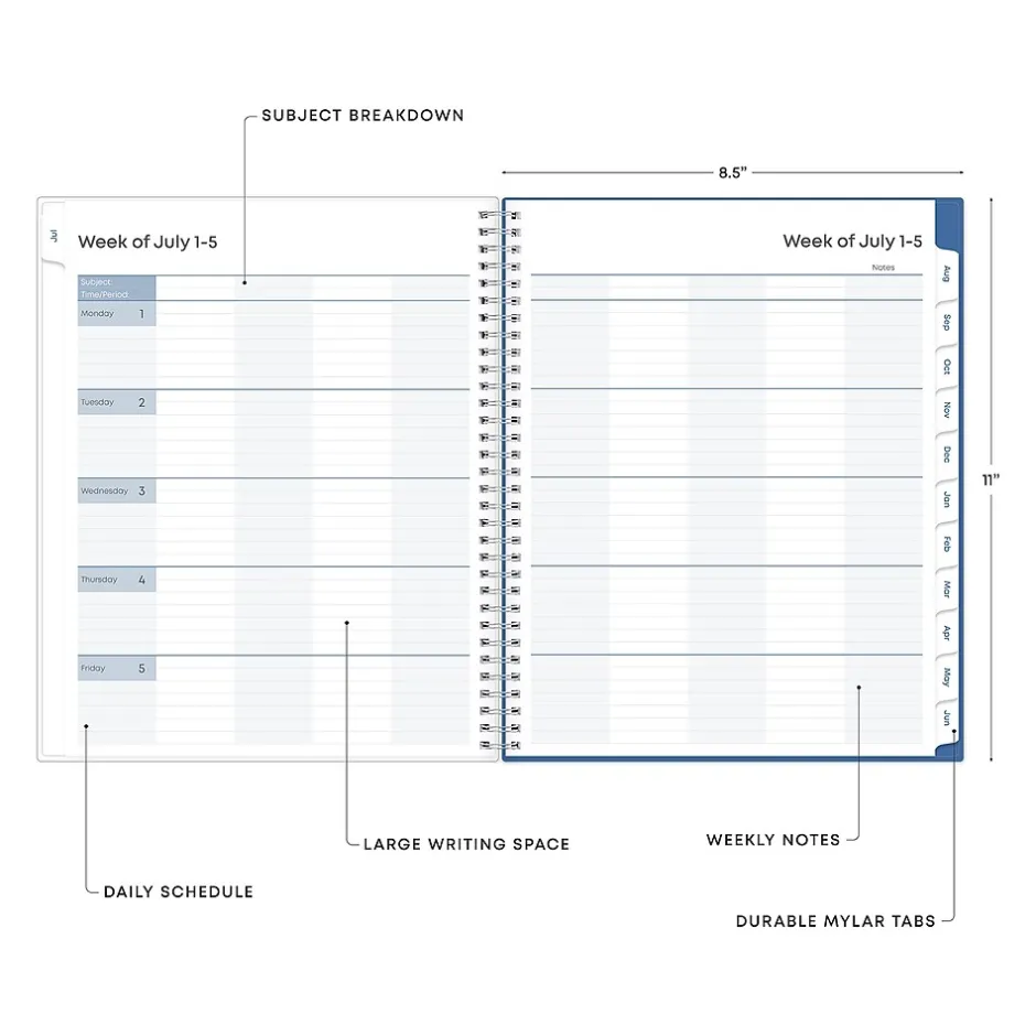Blue Sky teacher lesson planners keep you focused and organized. The Raquel teacher lesson planner has weekly planning space for up to nine classes or subjects. The monthly pages are tabbed and offer plenty of room for notes. Extras include a storage pocket and pages for weekly activities, class birthdays, and holidays.