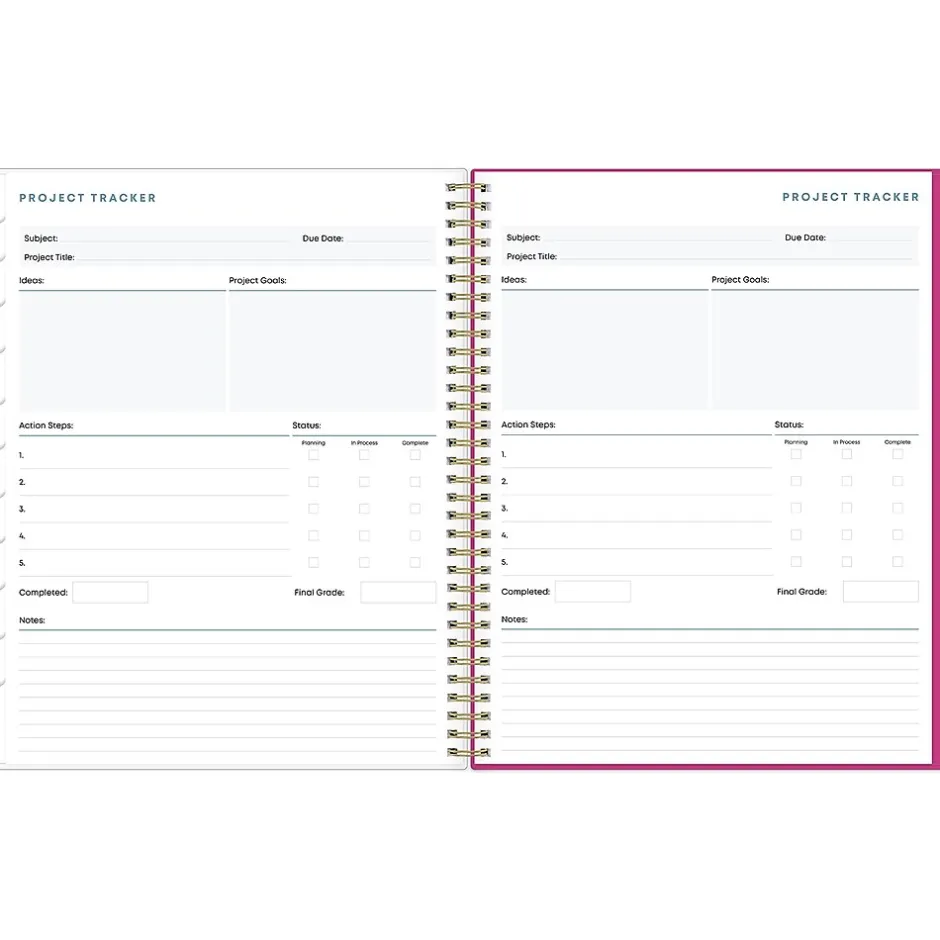 - Features one month per two pages and one week per two pages, with monthly quotes, weekly goals, projects this month section, class schedule, assignment and project tracker