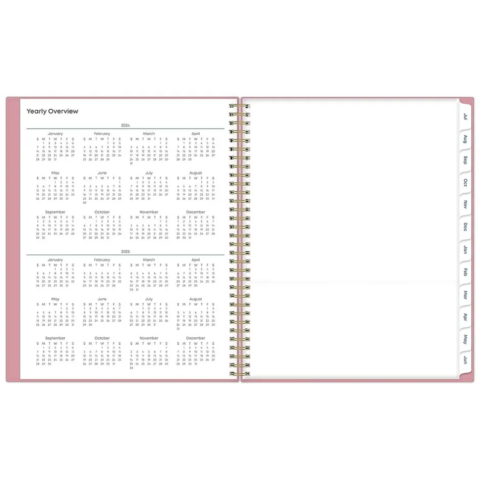- Features one month per two pages and one week per two pages, with space for notes and quick reference calendars