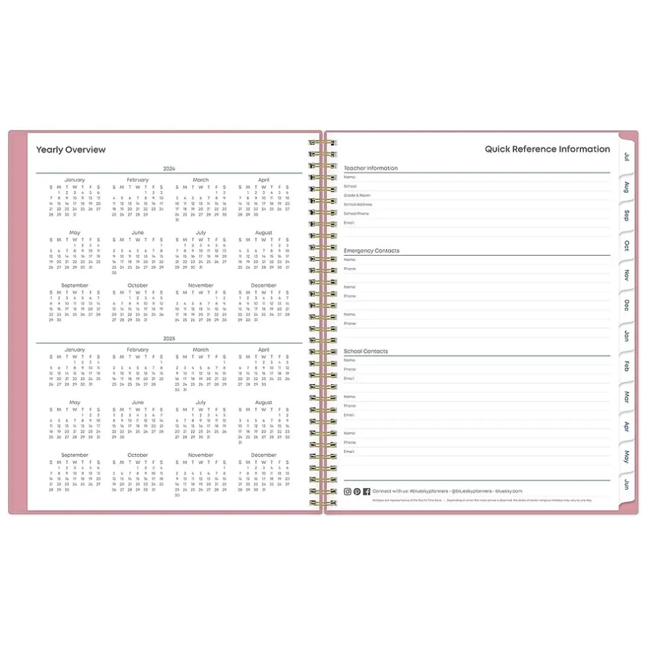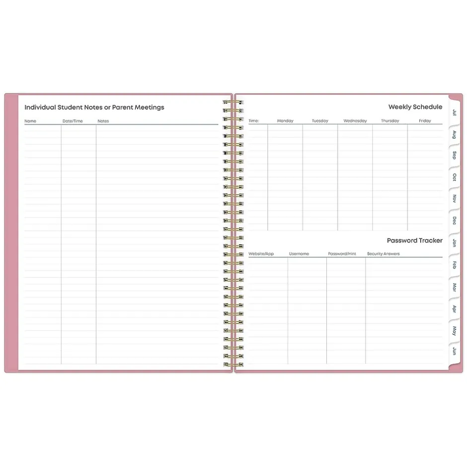 This Blue Sky Teacher Lesson planner keeps you focused and organized. This academic planner has weekly planning space for up to nine classes or subjects. Monthly pages are tabbed and offer plenty of room for notes. Extras include a storage pocket and pages for weekly activities, class birthdays, and holidays.