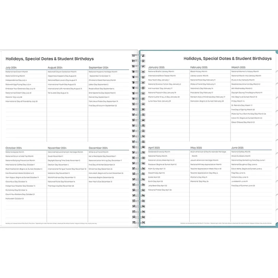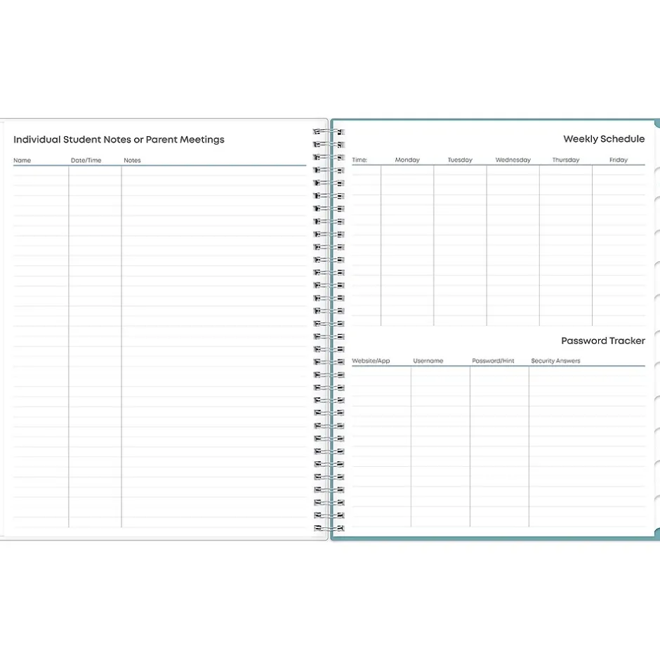 This Blue Sky Teacher Lesson Dots planner has weekly planning space for up to nine classes or subjects. Monthly pages are tabbed and offer plenty of room for notes. Extras include a storage pocket and pages for weekly activities, class birthdays, and holidays.