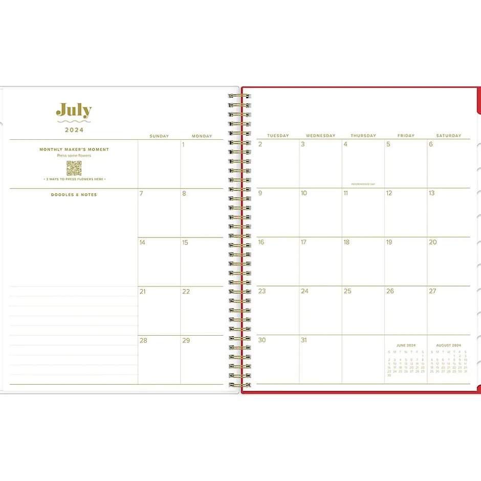 - Features one month per two pages and one week per two pages, with space for notes and quick reference calendars