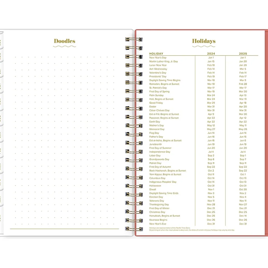 - One week per view, one month per view, notes pages and reference calendars, contacts, goals, holidays, and important dates