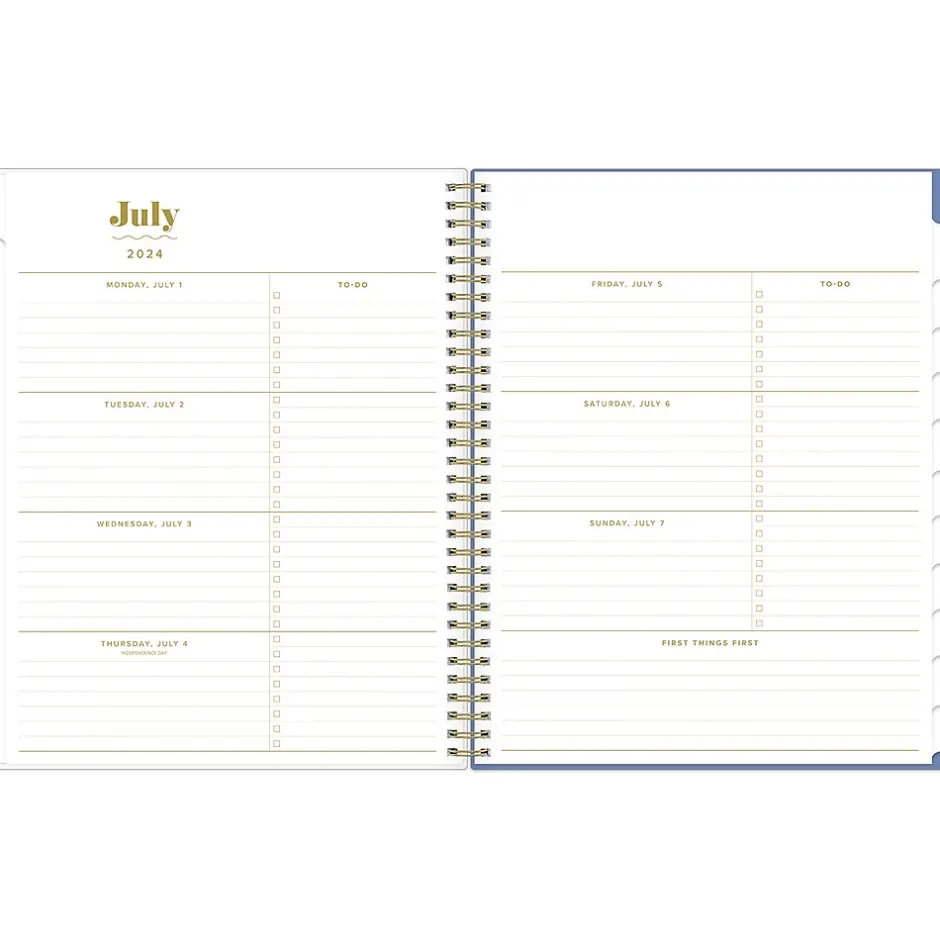 - Weekly and monthly academic planner covers a 12-month date range from July 2024 to June 2025