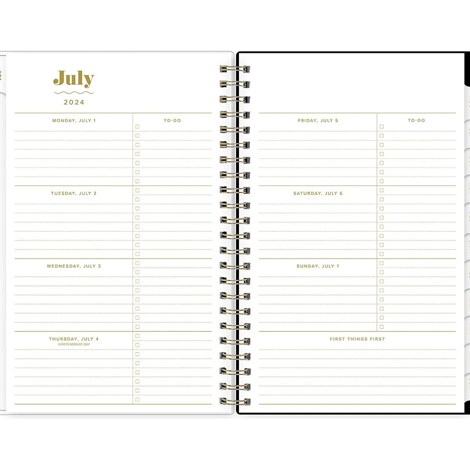 - One week per view, one month per view, notes pages, reference calendars, contacts, goals, holidays, and important dates