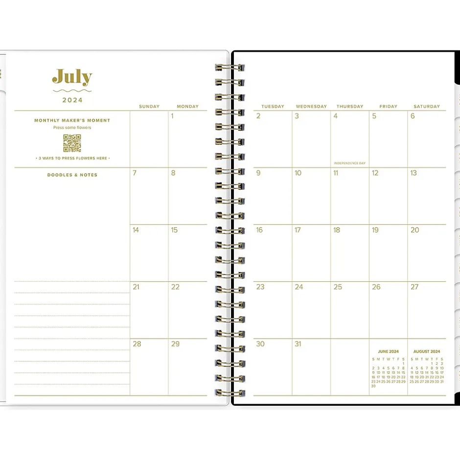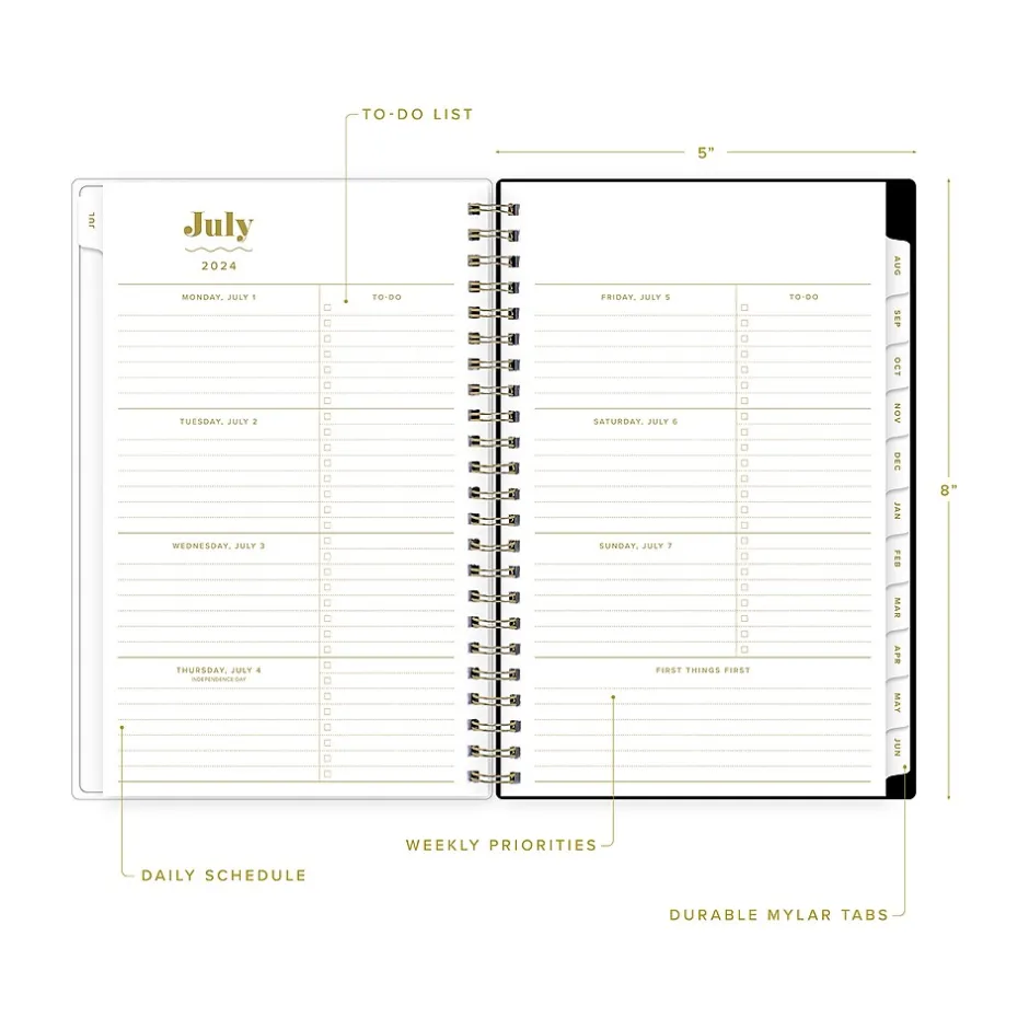 - Weekly and monthly academic planner covers a 12-month date range from July 2024 to June 2025