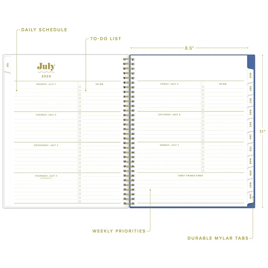 - Weekly and monthly planner covers a 12-month academic date range from July 2024 to June 2025